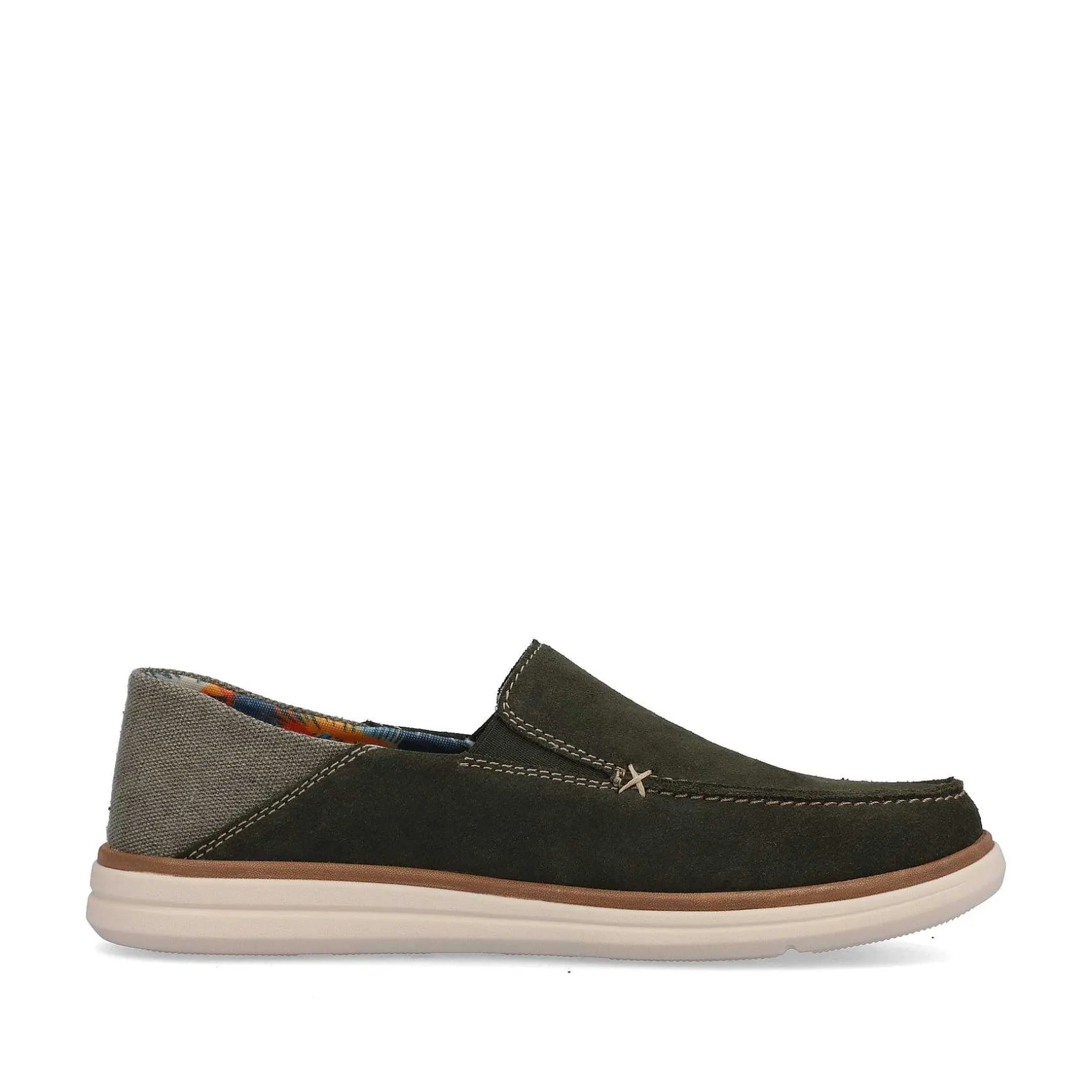 This Green Sport & Style Rieker Slipper For Men Made Of High-Quality Suede Offers Easy Entry With The Elastic Band. The Tr Sole Is Also Durable And Offers Good Grip On All Surfaces. The Removable, Soft Insole Provides Cushioning. On Top: Comfort Width For A Perfect Fit.