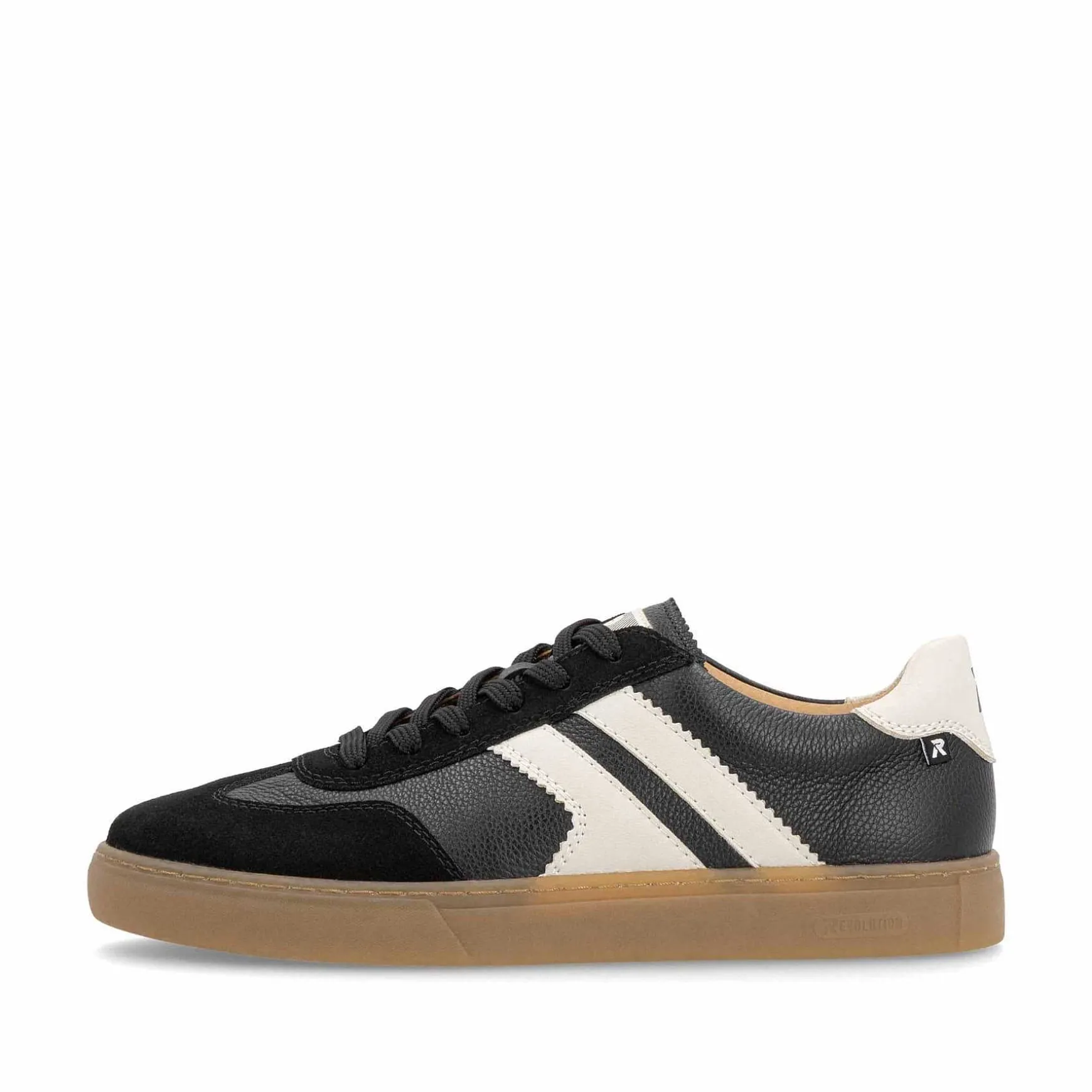 Black Rieker Sneaker Low For Men In A Sporty Retro Look. The Classic Silhouette Made Of Smooth Leather And The Black And White Design On A Honey-Colored Sole Bring Back The Street Style Vibes Of The 80S And 90S! Sporty Walking Experience Included: Durable Tr Sole With Soft Eva Inlet, Cushioning, Removable Insole And Breathable Leather Lining.