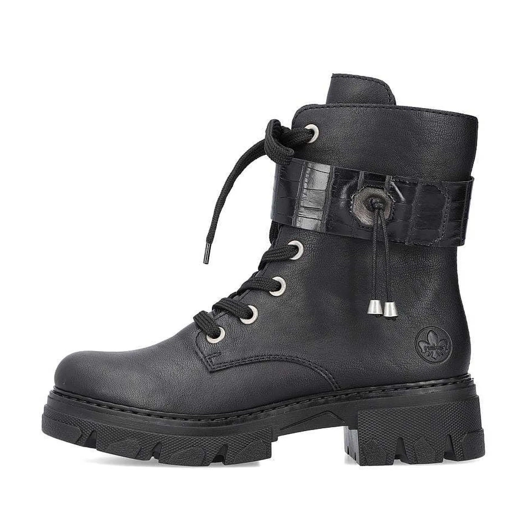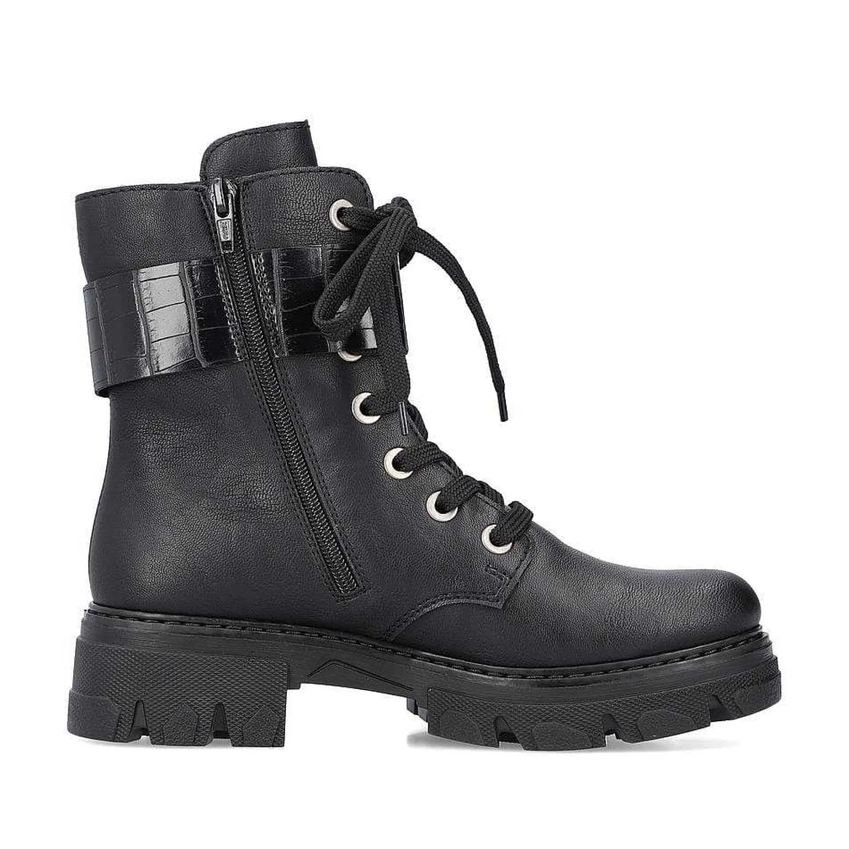 Cool Style And Still Warm Feet? These Deep Black Biker Boots With A High Shaft From Rieker Are Super Casual And Totally Comfortable. The Clever Combination Of Zipper And Lacing Makes It Easy To Put On And Take Off. A Surrounding Decorative Element In A Snakeskin Look Skilfully Refreshes The Design. The Light And Shock-Absorbing Chunky Sole Offers A Lasting Feeling Of Well-Being – Even On Long Days. Another Plus Is The Soft Insole. Cozy Warm Lining Is Guaranteed To Keep Your Feet Nice And Warm All Day Long. Feel Good Included!