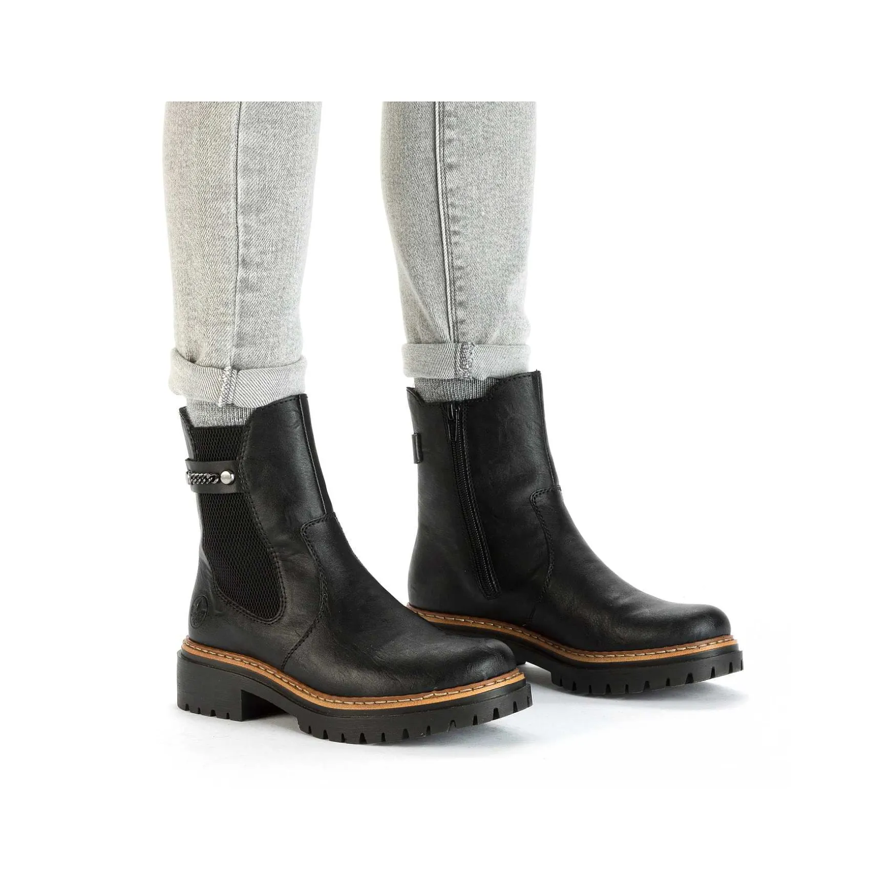 Easy Walking, Easy Living! Get Out And About In Maximum Comfort And Ultimate Style With These Everyday Asphalt Black Chelsea Boots From Rieker. The Zipper Together With The Elastic Insert Typical Of Chelsea Boots Makes It Easy To Put On And Take Off. The Decorative Silver Chain On The Side Perfectly Rounds Off The Modern Design. The Sole Is Both Shock-Absorbing And Light, Offering A Double Feeling Of Well-Being With Every Step. Another Plus Is The Extra Soft Insole. The Model Is Also The Perfect Choice For Women With Large Feet, Because The Shoe Is Available Up To Size 43. Simply Slip Them On And Off You Go!