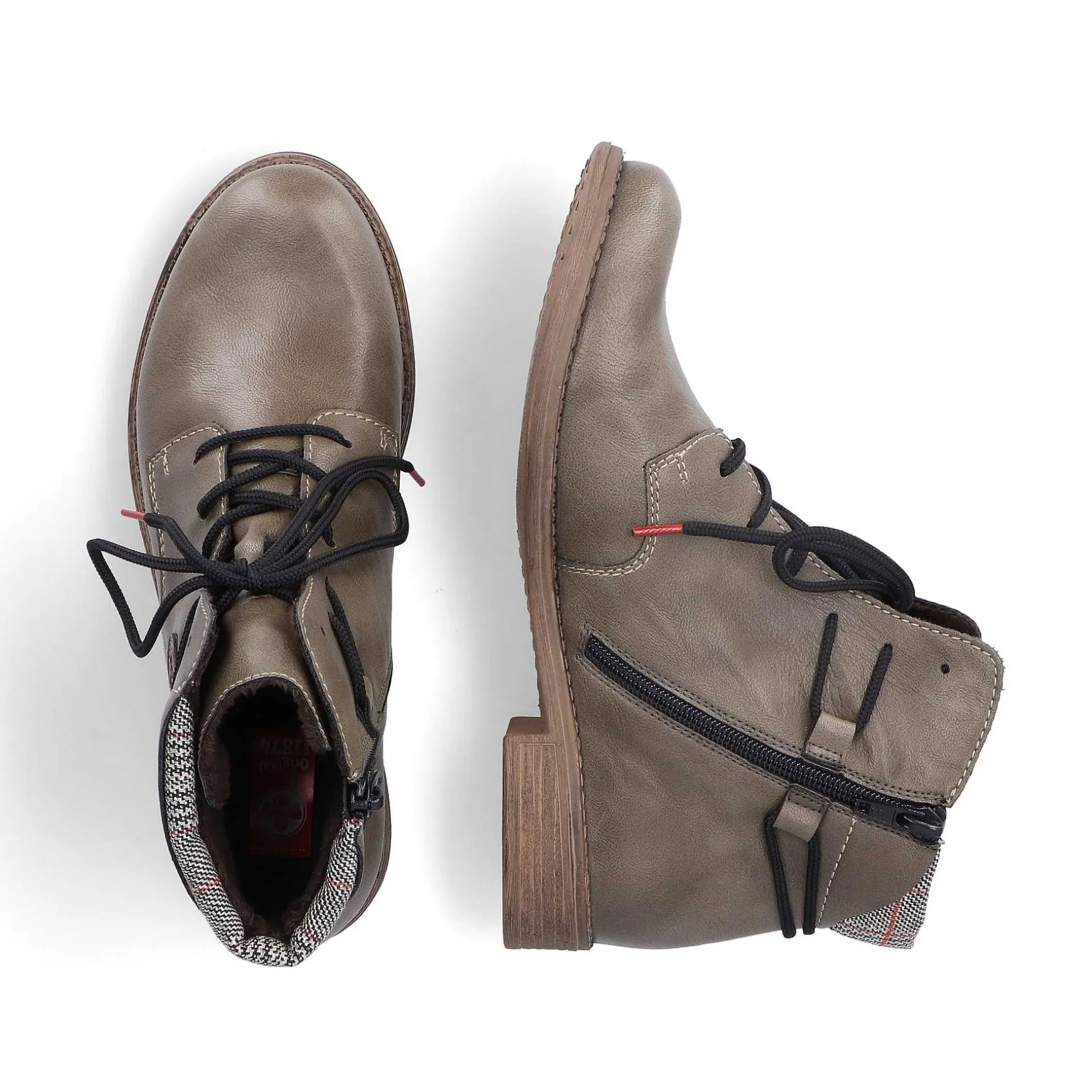 Dream Team – Style And Comfort! With These Grey-Green Lace-Up Boots, Rieker Proves Once Again That You Can Combine Comfort With A Fashionable Look. The Clever Combination Of Lacing And Zipper Provides Optimal Support And Allows You To Put It On And Take It Off Quickly. The Applied Brown Logo In A Button Look Harmoniously Rounds Off The Look Of The Shoe. The Robust Profile Sole Makes Every Step A Safe Affair And The Extra Soft Insole Is Another Plus. Attention, Favorite Shoe Potential!