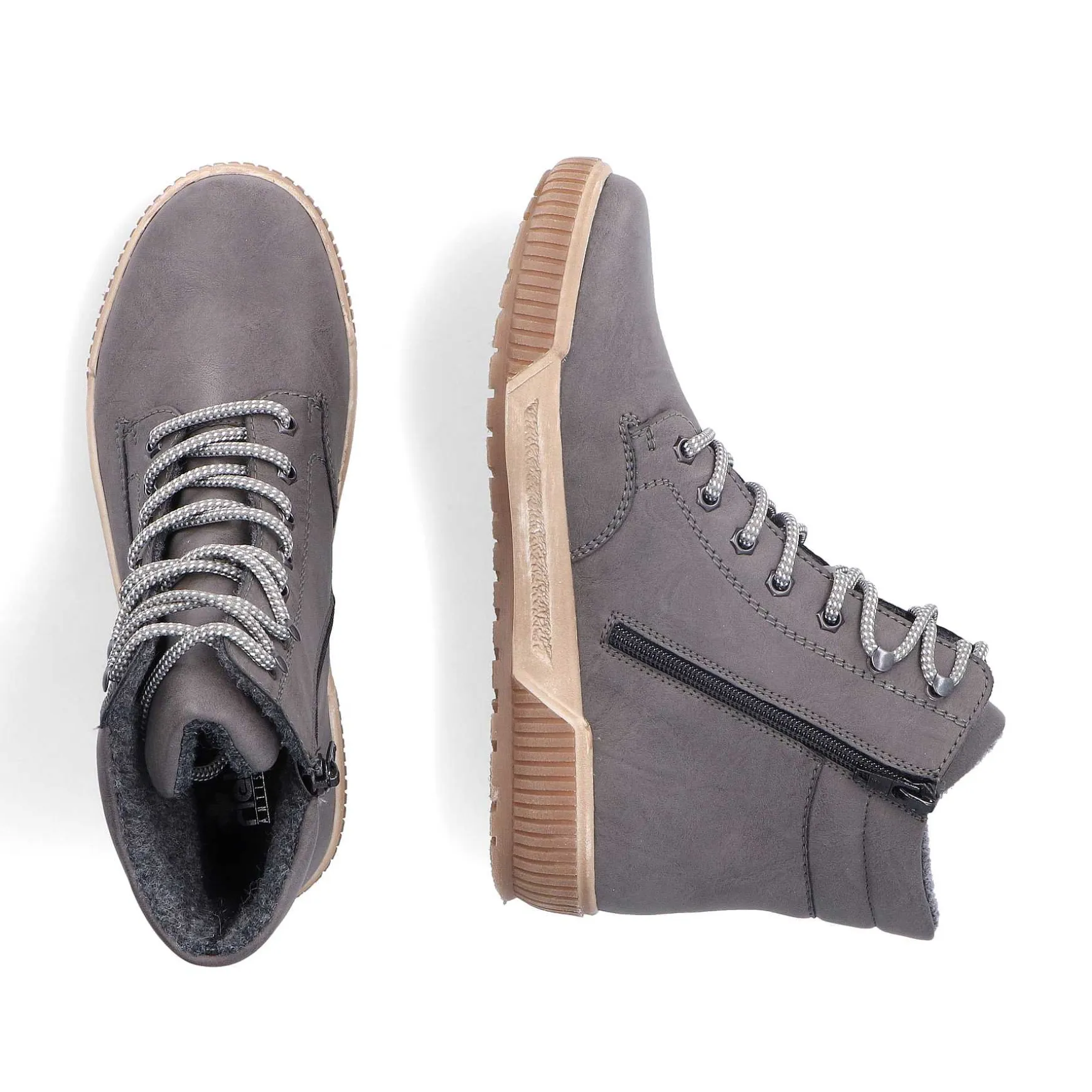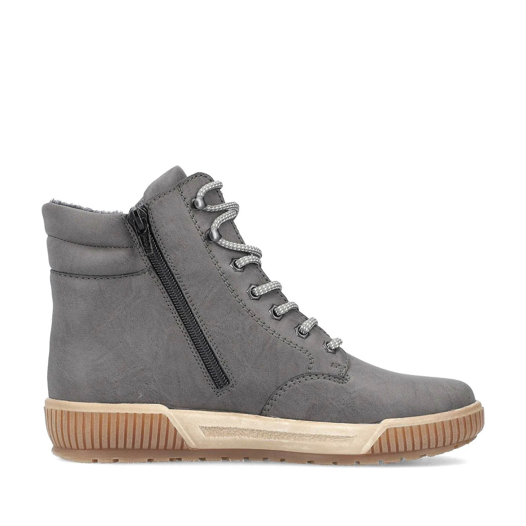 On The Fashion Radar! These Moon Gray Lace-Up Boots From Rieker Impress With Real Comfort For Your Feet. The Clever Combination Of Lacing And Zipper Guarantees A Perfect Fit And Good Support. The Robust Profile Sole Provides Good Grip At Every Turn. The Lace-Up Boots Are Super Comfortable Thanks To The Padded And Removable Insole. The Comfort Width G Offers Enough Space So That The Feet Feel Comfortable Even When Worn For Longer Periods. Nothing Stands In The Way Of Long Walks!
