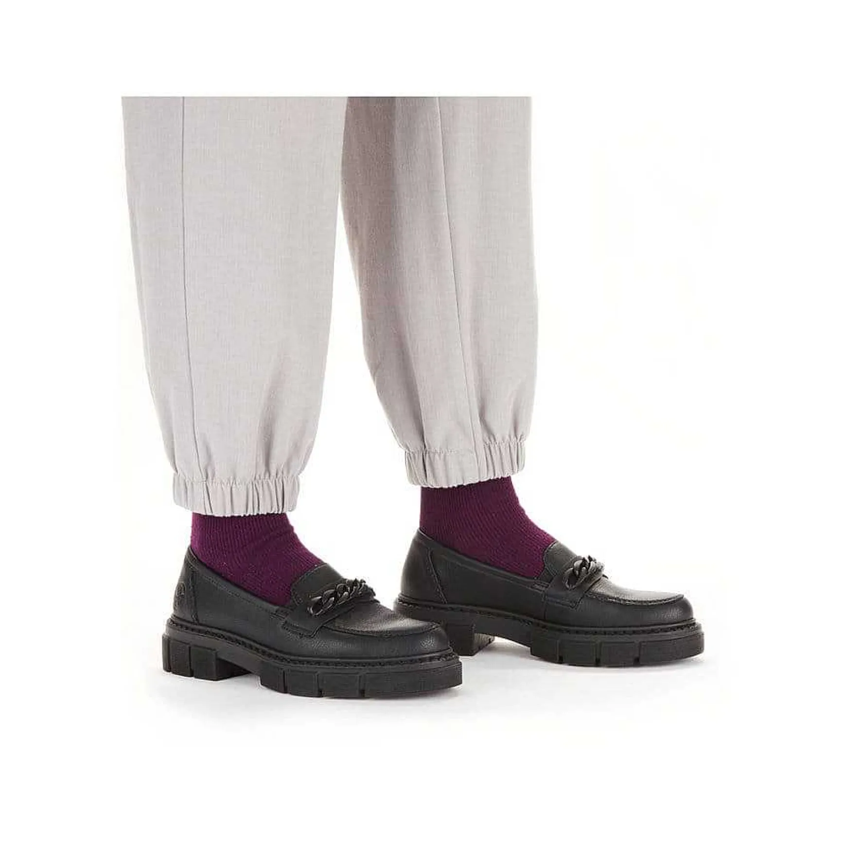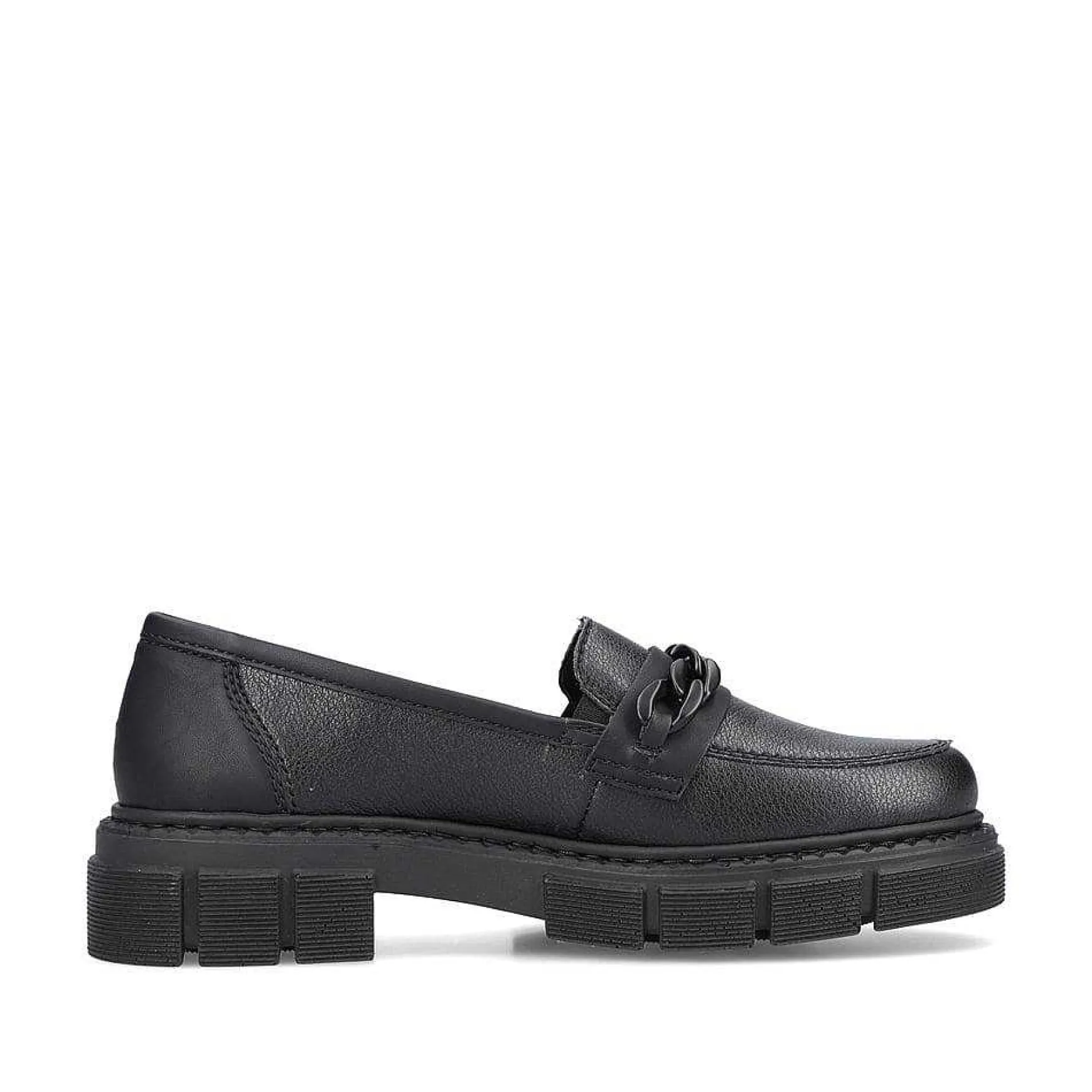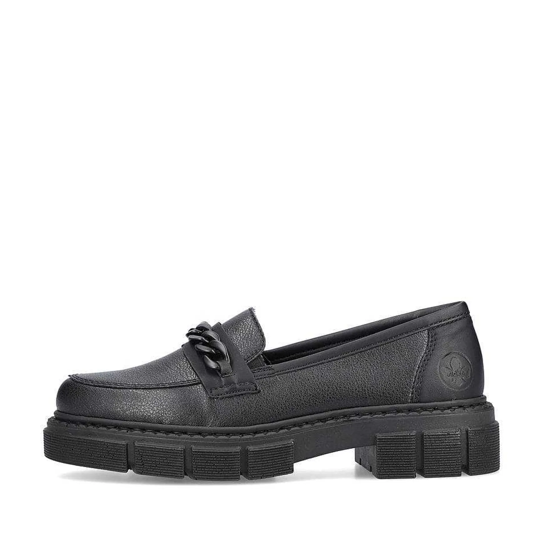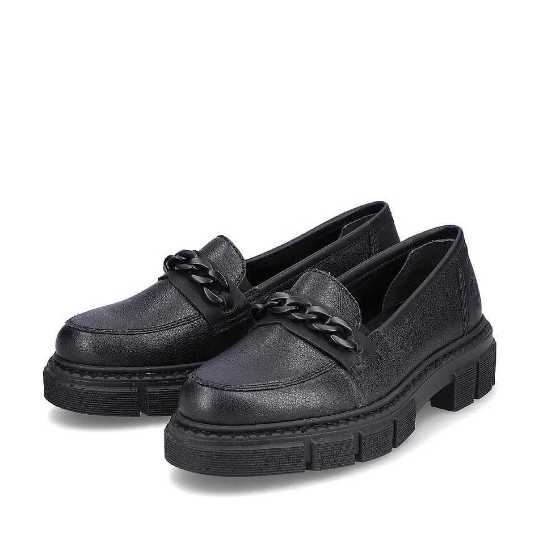 Fashion Meets Function. These Deep Black Rieker Loafers For Women Made Of Smooth Leather Impress With Real Comfort For The Feet. Without A Fastener, The Model Can Also Be Easily Put On. The Light And Shock-Absorbing Platform Sole Is A Feel-Good Factor On Top And The Extra Soft Insole Is Another Plus. Feel Good Included!
