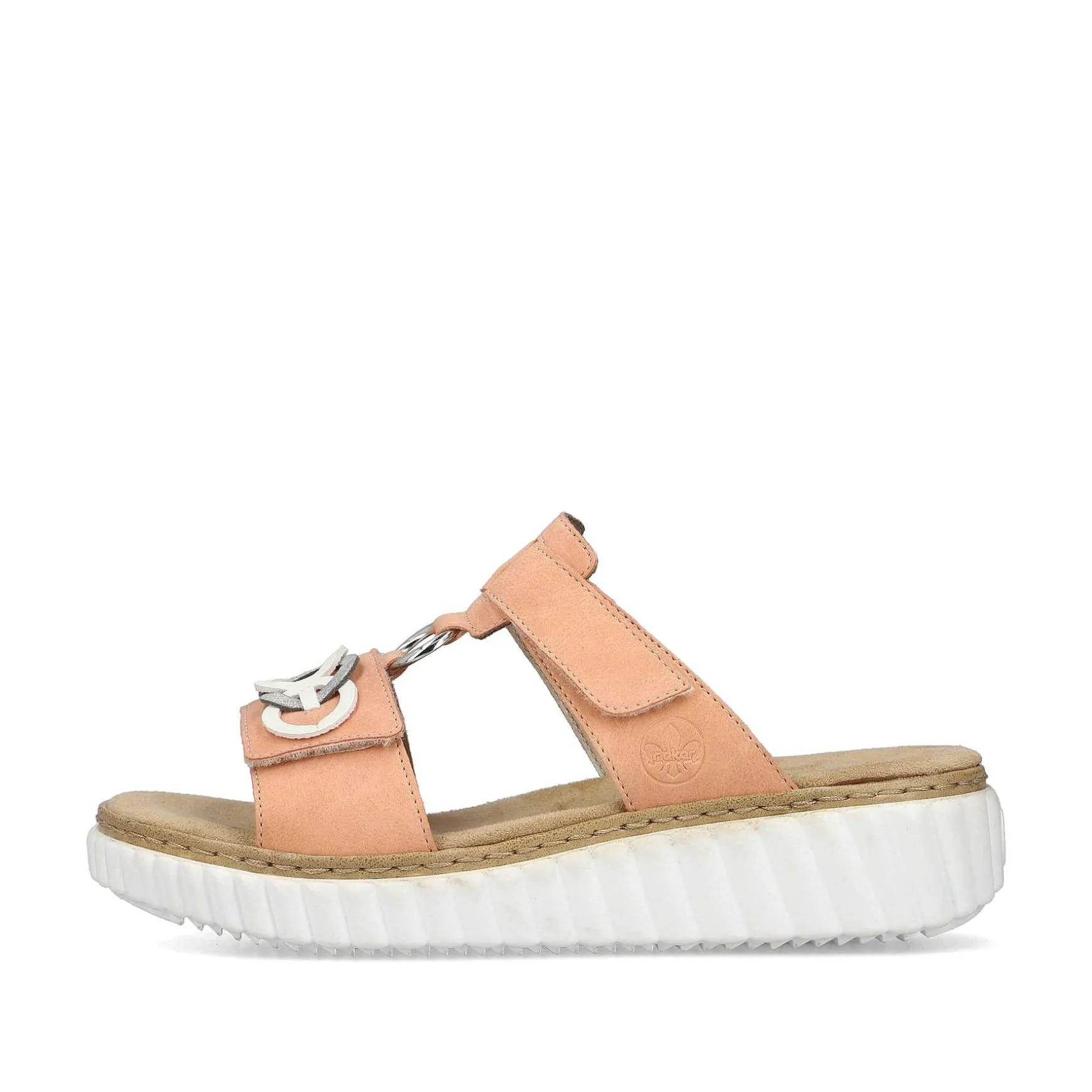 Happy Feet, Happy Life! These Rieker Mules For Women In Peach Colors Will Really Let Your Feet Feel The Summer. The Velcro Fastener Allows For Quick Entry And Keeps The Shoe Ideally On The Foot. The Decorative Jewelry Decoration Is A Pretty Detail. The Open Shoe As Well As The Shock-Absorbing And Very Light Sole With Wedge Heel Ensure A Lasting Feeling Of Well-Being. Another Plus Is The Extra Soft Insole. Thanks To The Extra Wide H, The Feet Have More Space In The Shoe. Slip In And Feel Good!