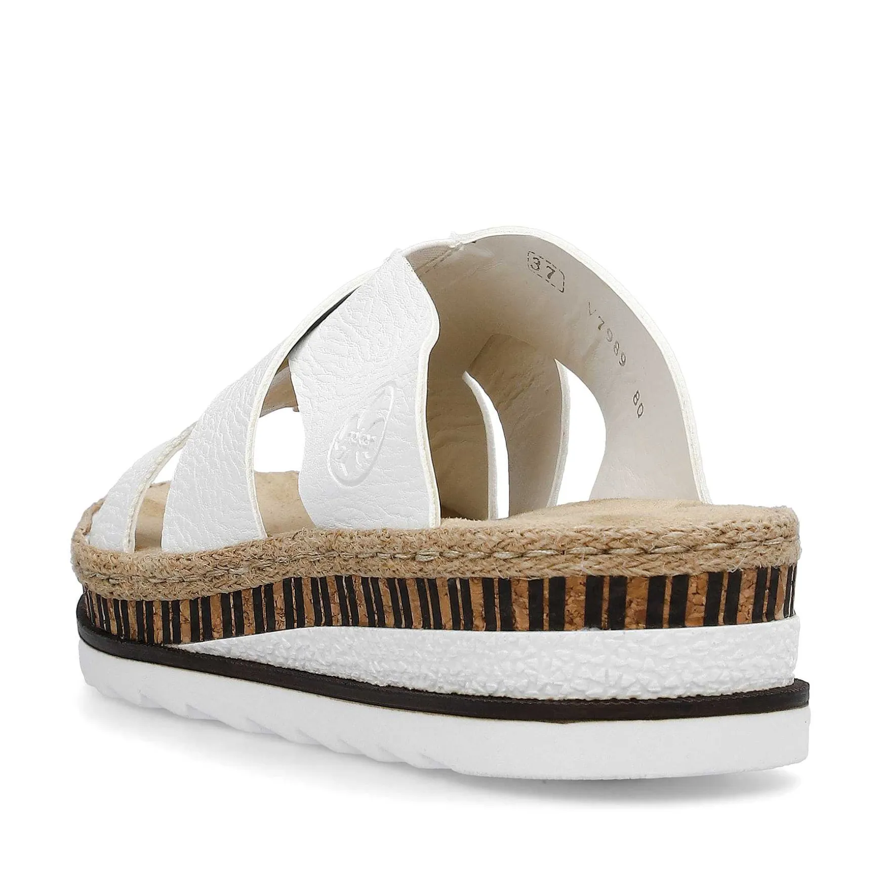 Attention Trend Alert! These Rieker Mules For Women In Pure White Are Guaranteed To Get You In The Holiday Mood. The Model Has No Fastener And Can Therefore Be Easily Put On. The Stripe Design On The Sole Is A Real Eye-Catcher. The Open Shoe And The Very Light And Shock-Absorbing Sole Ensure A Lasting Feeling Of Well-Being. In Addition, The Extra Soft Insole Ensures An Extra Portion Of Comfort. Thanks To The Narrow Fit E 1/2, The Shoe Fits Perfectly. Simply Slip On And Enjoy – With Rieker!