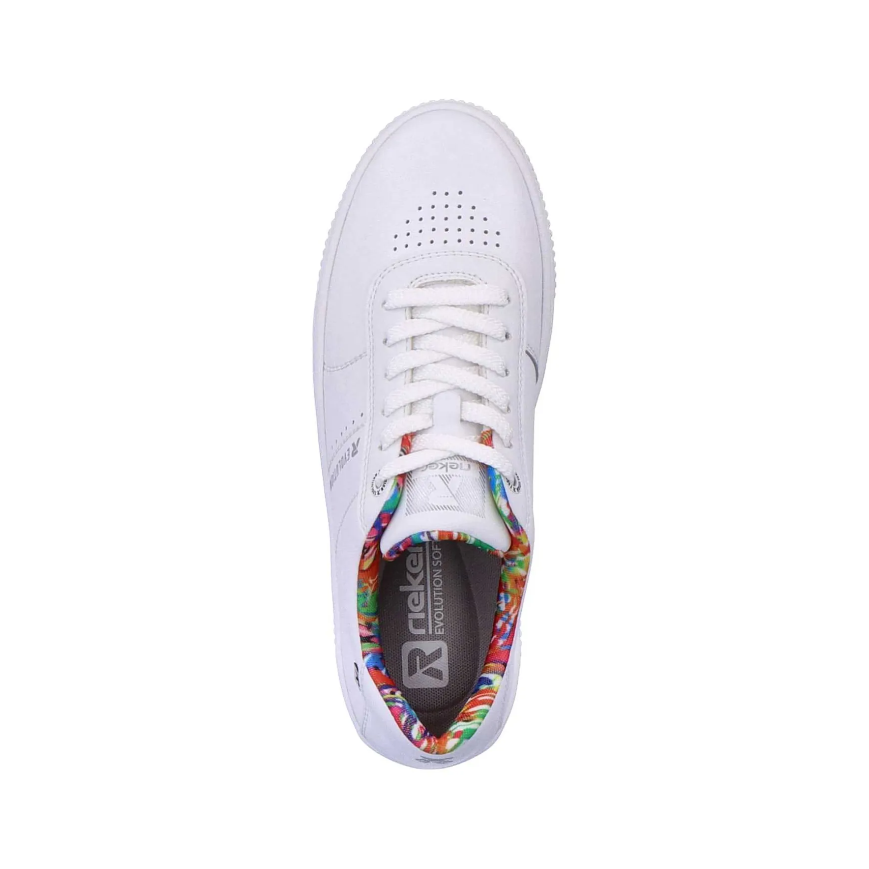 White Sport & Style Rieker Sneaker Low With Multicolor Inner Material Made Of High-Quality Smooth Leather For Women. The Abrasion-Resistant Tr Sole Provides Good Grip On Various Surfaces, While The Softly Padded, Removable Insole Perfectly Cushions Your Steps.