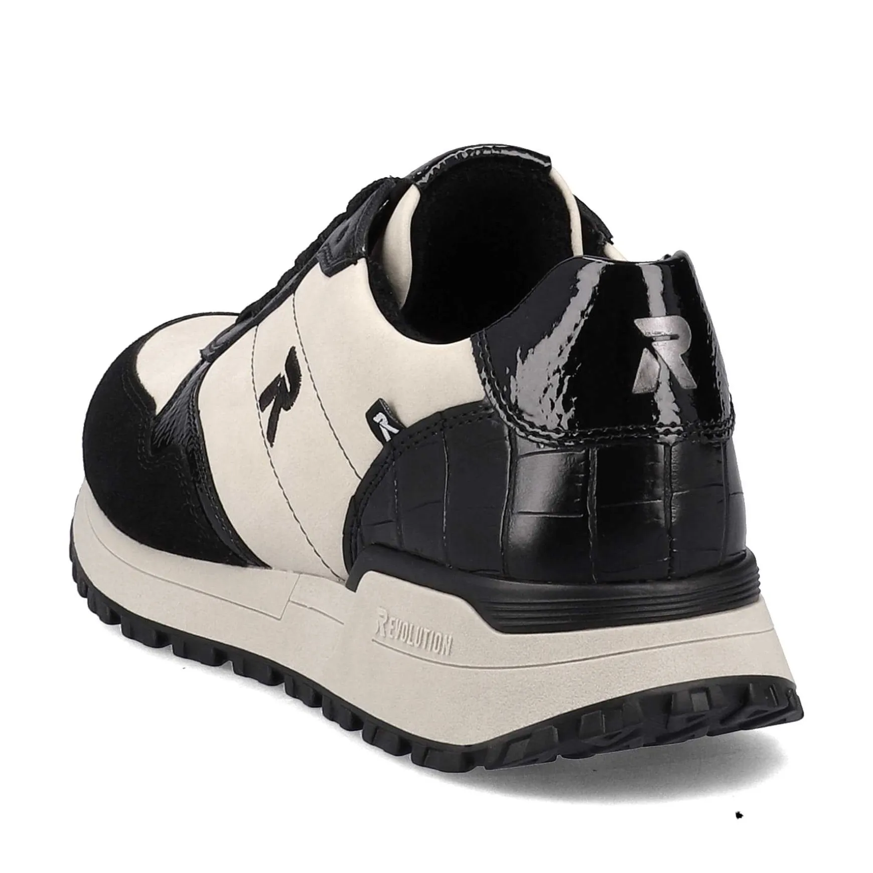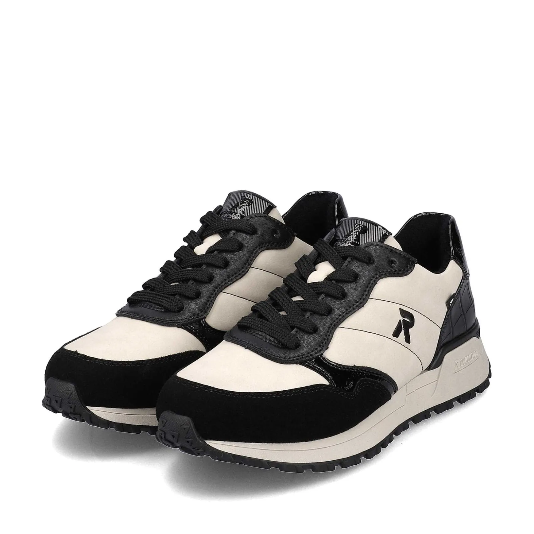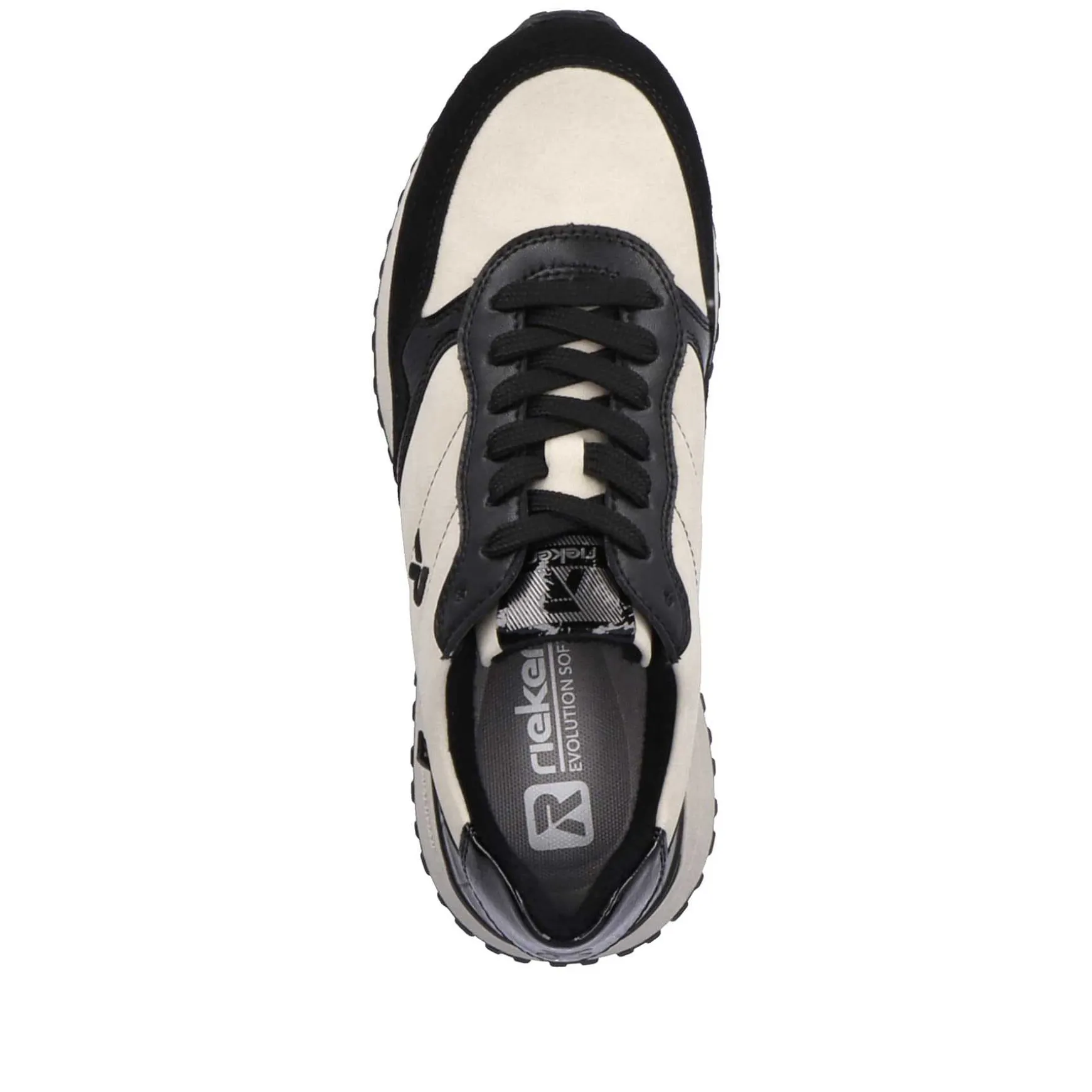 Sport & Style Rieker Sneaker Low For Women In Beige-Black Made Of High-Quality Artificial Leather. The Lighttr Sole Provides Perfect Traction On All Surfaces. The Removable, Soft Insole Provides Ideal Cushioning.