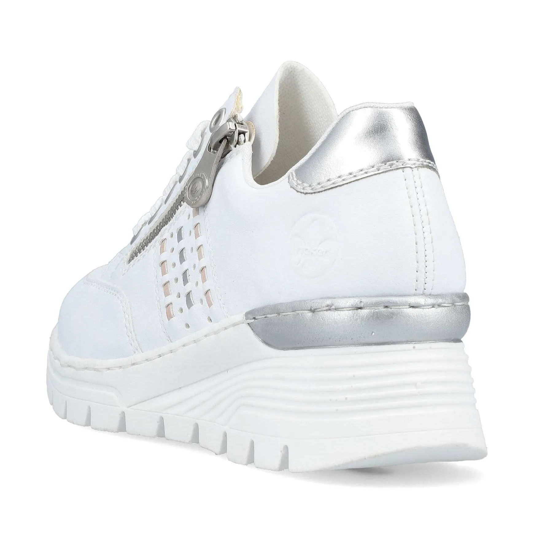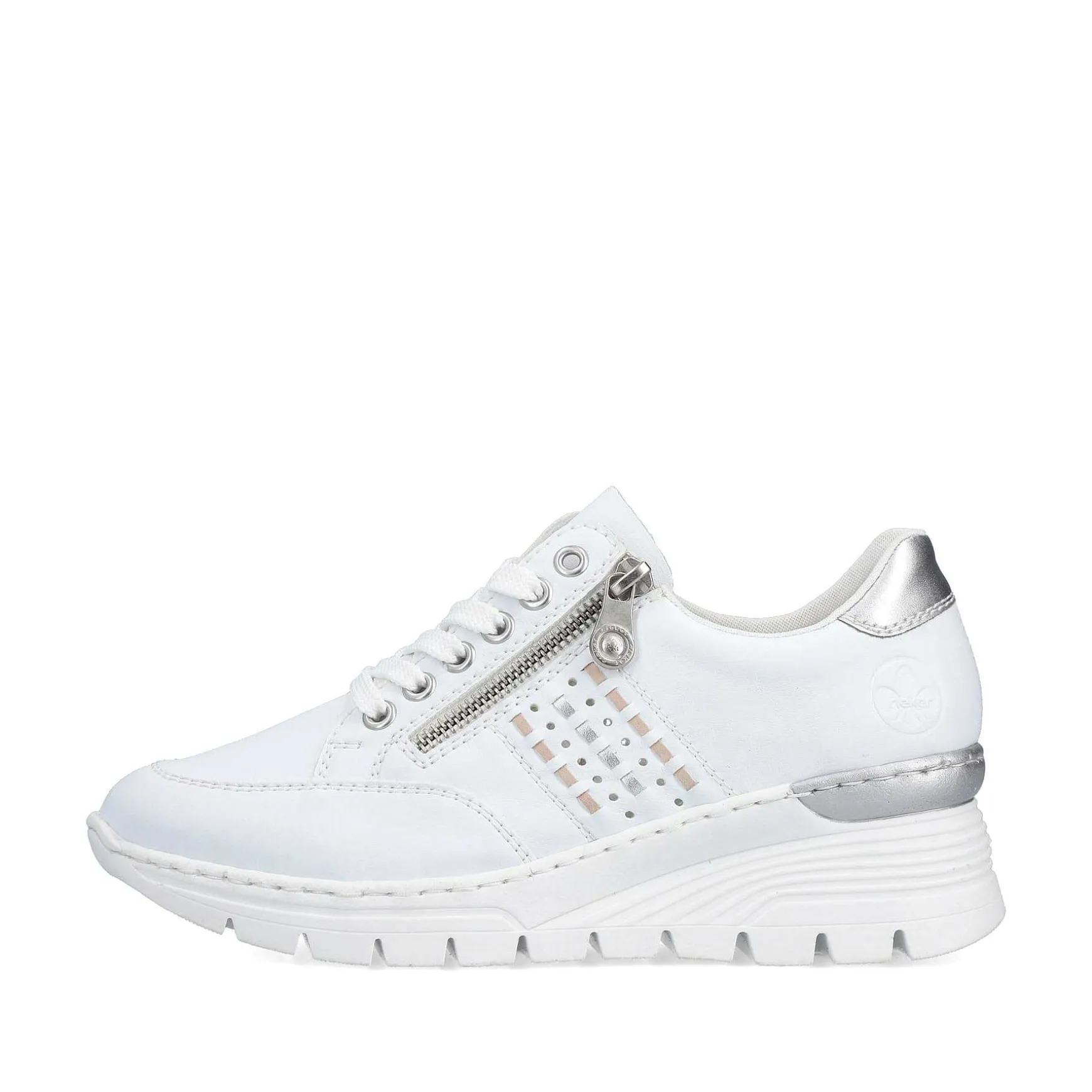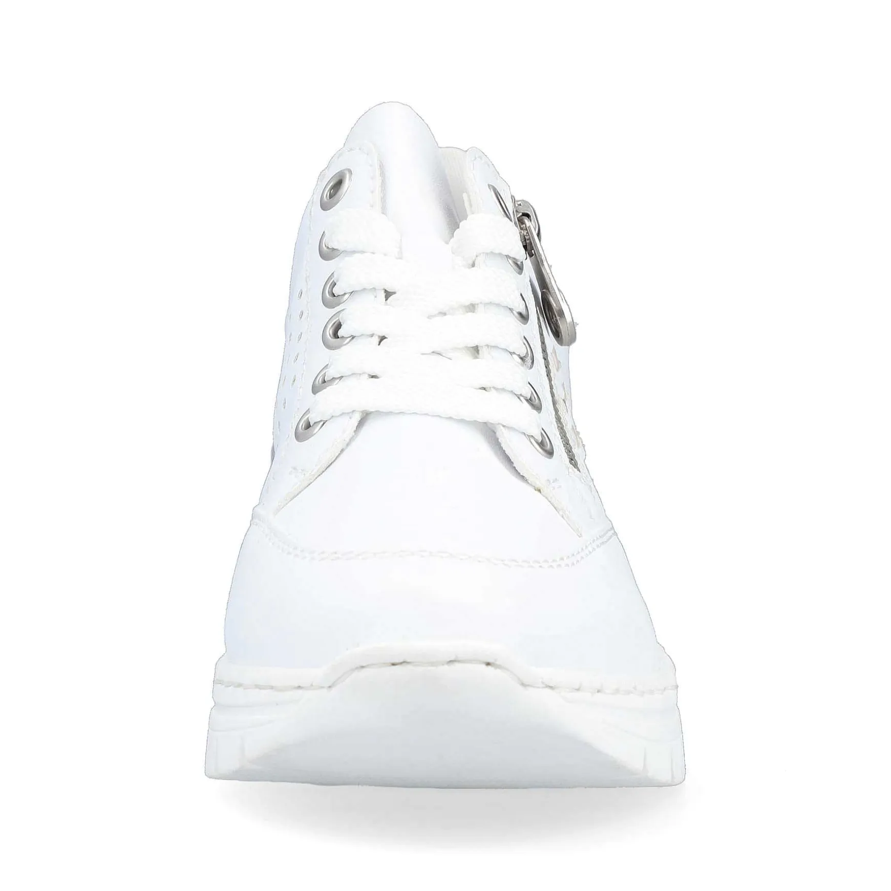 Always The One: With These Everyday Pure White Rieker Low Sneakers For Women You Are Always Well Dressed And Can Rely On Maximum Comfort. In Addition To The Zipper, The Model Also Has Lacing And Ensures A Perfect Fit. The Decorative Seams On The Side Give The Shoe That Certain Something. The Very Light And Shock-Absorbing Sole Offers A Lasting Feeling Of Well-Being – Even On Long Days. With The Removable Insole, The Sneakers Have Another Practical Comfort Feature. The Model Is Cut In A Comfortable Width G And Ensures Enough Space For The Foot. More Is Not Possible!