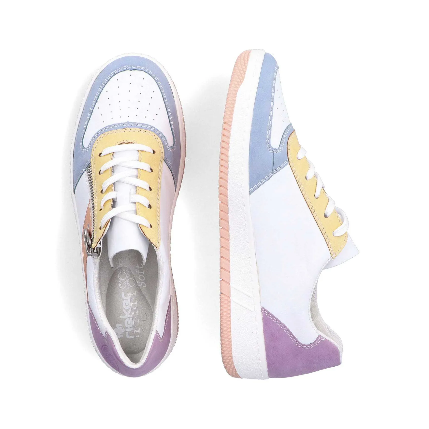 These White And Colorful Sport & Style Rieker Sneaker Low For Women Are Made Of High-Quality Faux Leather And Have The Top Combination Of Zipper And Lacing. The Abrasion-Resistant Tr Sole Provides Good Traction, Is Durable And Provides A Good Grip On Various Surfaces. The Insole Is Softly Padded And Easy To Remove.
