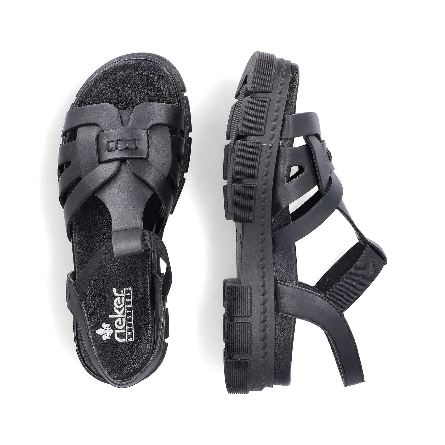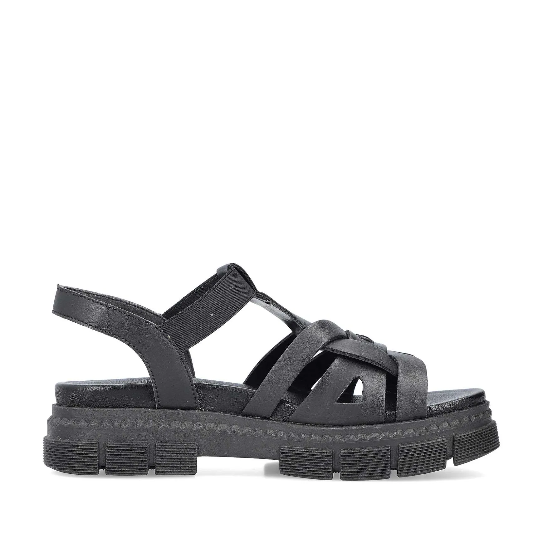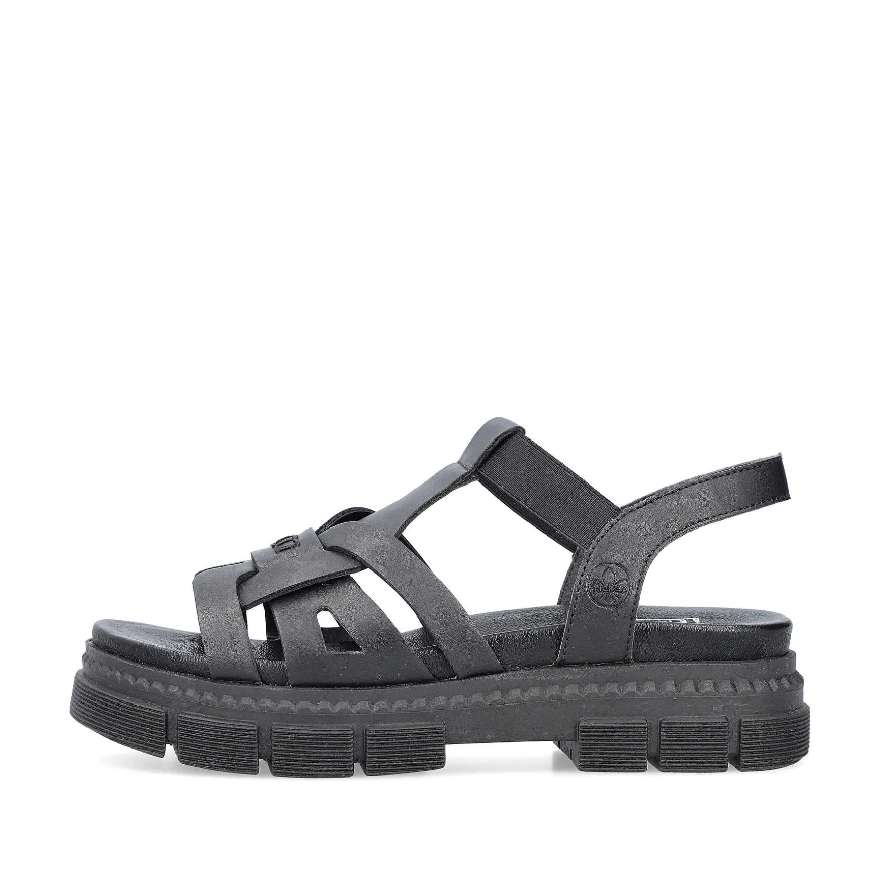 We Love Black! These Asphalt Black Faux Leather Strappy Sandals From Rieker Have Been Crafted Using A Completely Vegan Manufacturing Process And Are Made From 100% Vegan Materials. The Elastic Insert Makes It Particularly Easy To Put On And Take Off. The Wide Straps, Together With The Heel Strap, Ensure Optimal Support. The Non-Slip And Light Platform Sole Ensures Good Grip. In Addition, The Slim E 1/2 Fit Provides Additional Support. All In One – Great!