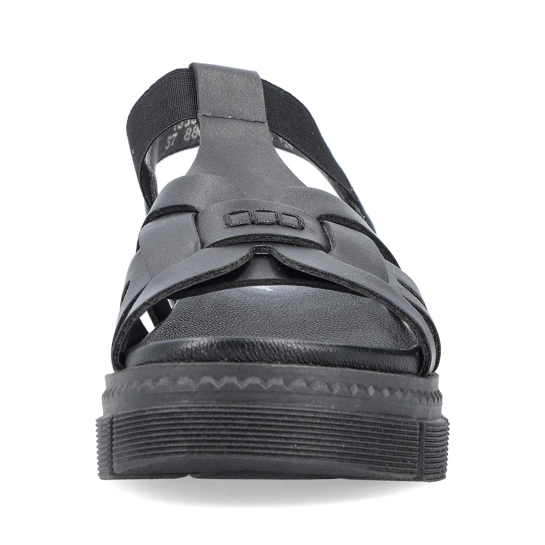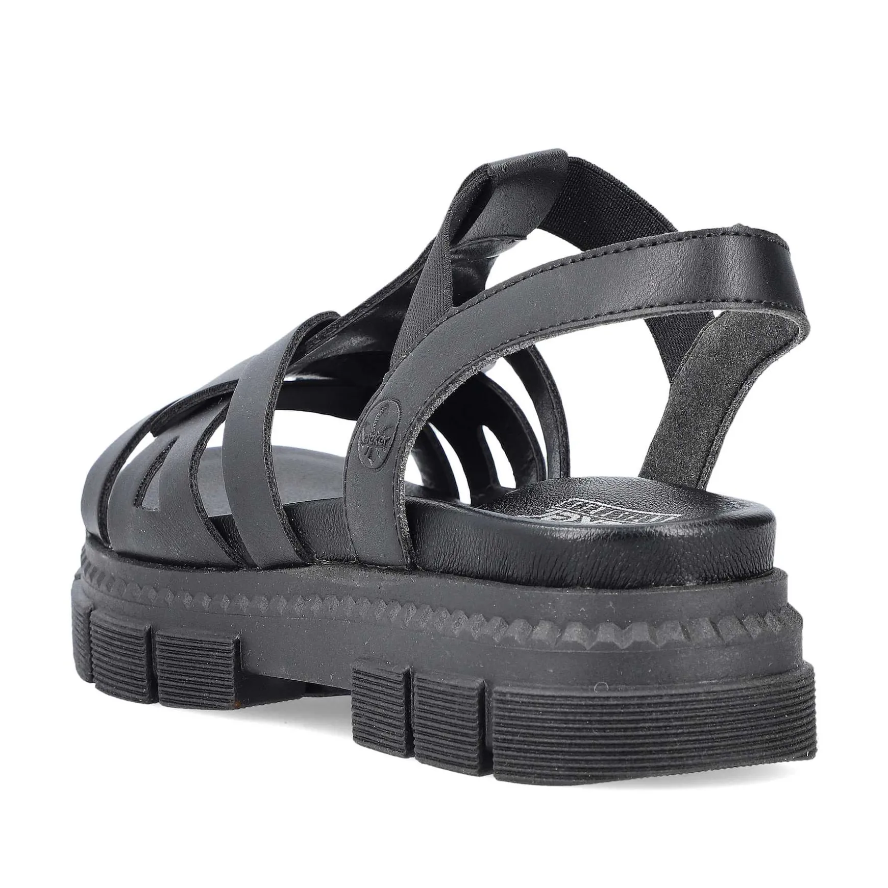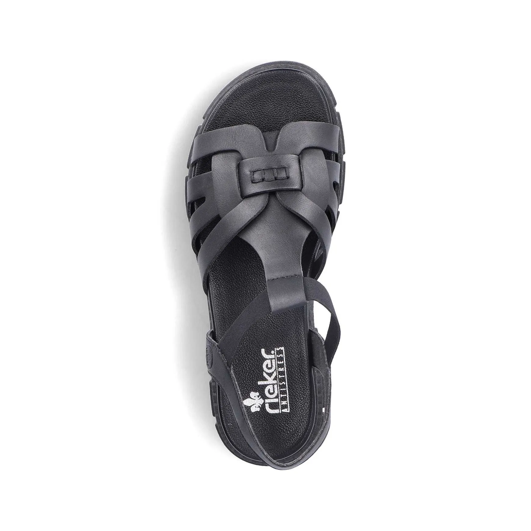 We Love Black! These Asphalt Black Faux Leather Strappy Sandals From Rieker Have Been Crafted Using A Completely Vegan Manufacturing Process And Are Made From 100% Vegan Materials. The Elastic Insert Makes It Particularly Easy To Put On And Take Off. The Wide Straps, Together With The Heel Strap, Ensure Optimal Support. The Non-Slip And Light Platform Sole Ensures Good Grip. In Addition, The Slim E 1/2 Fit Provides Additional Support. All In One – Great!