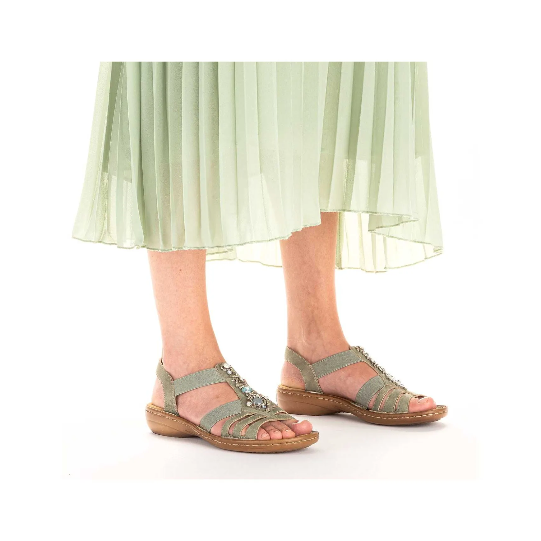 Wow Factor! These Mint Green Rieker Strappy Sandals For Women Guarantee A Heavenly Feel. The Elastic Insert Makes It Easy To Put On And Take Off. The Middle Strap With Decorative Decorative Elements Perfectly Rounds Off The Modern Design. The Light And Shock-Absorbing Sole Offers The Best Walking Comfort. Extra Support Is Provided By The Slim E 1/2 Fit. Your Style, Your Summer!
