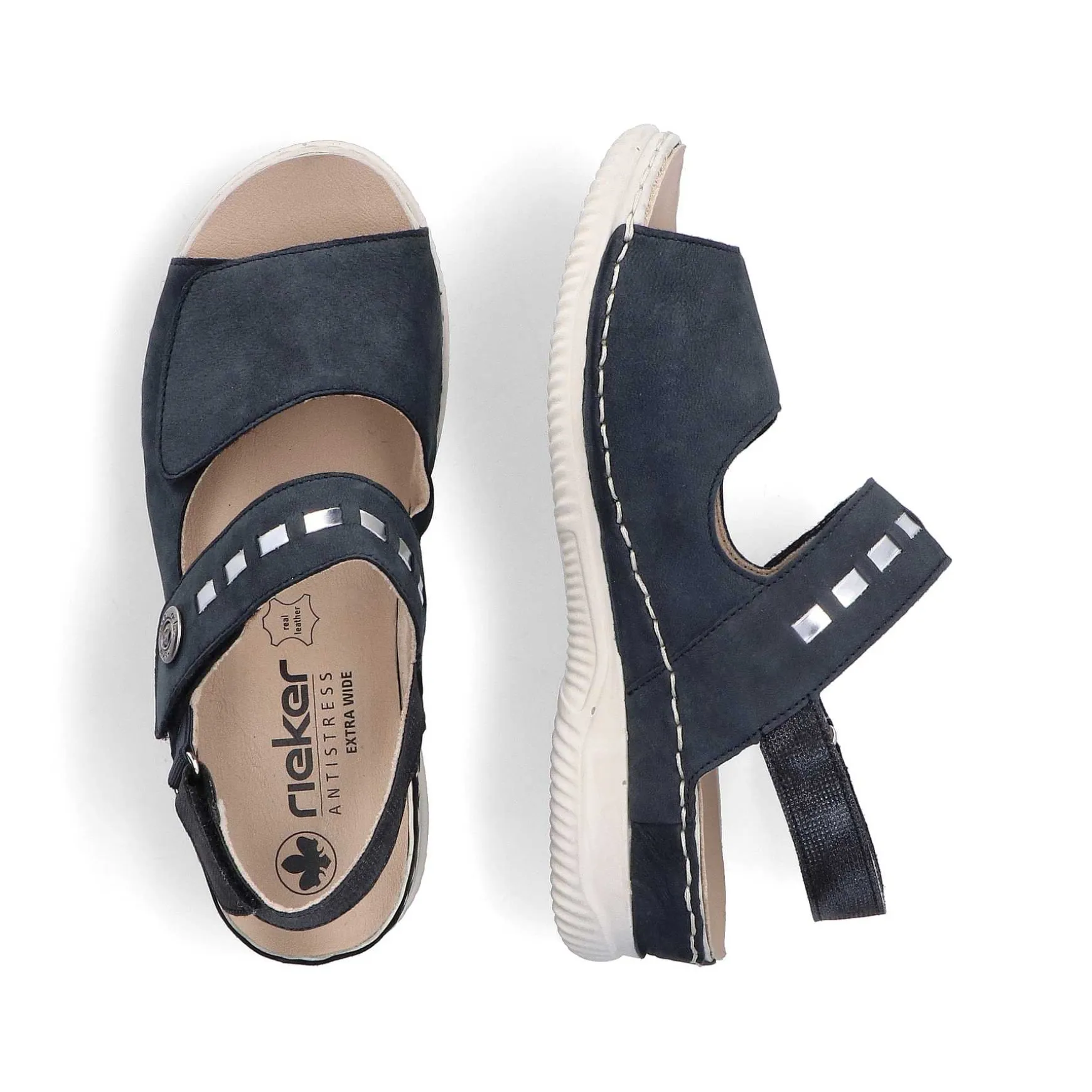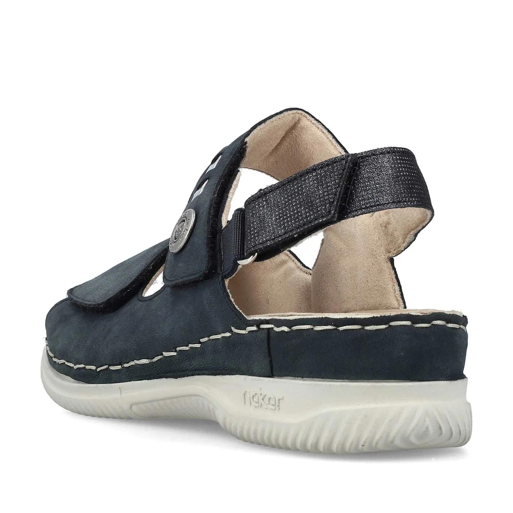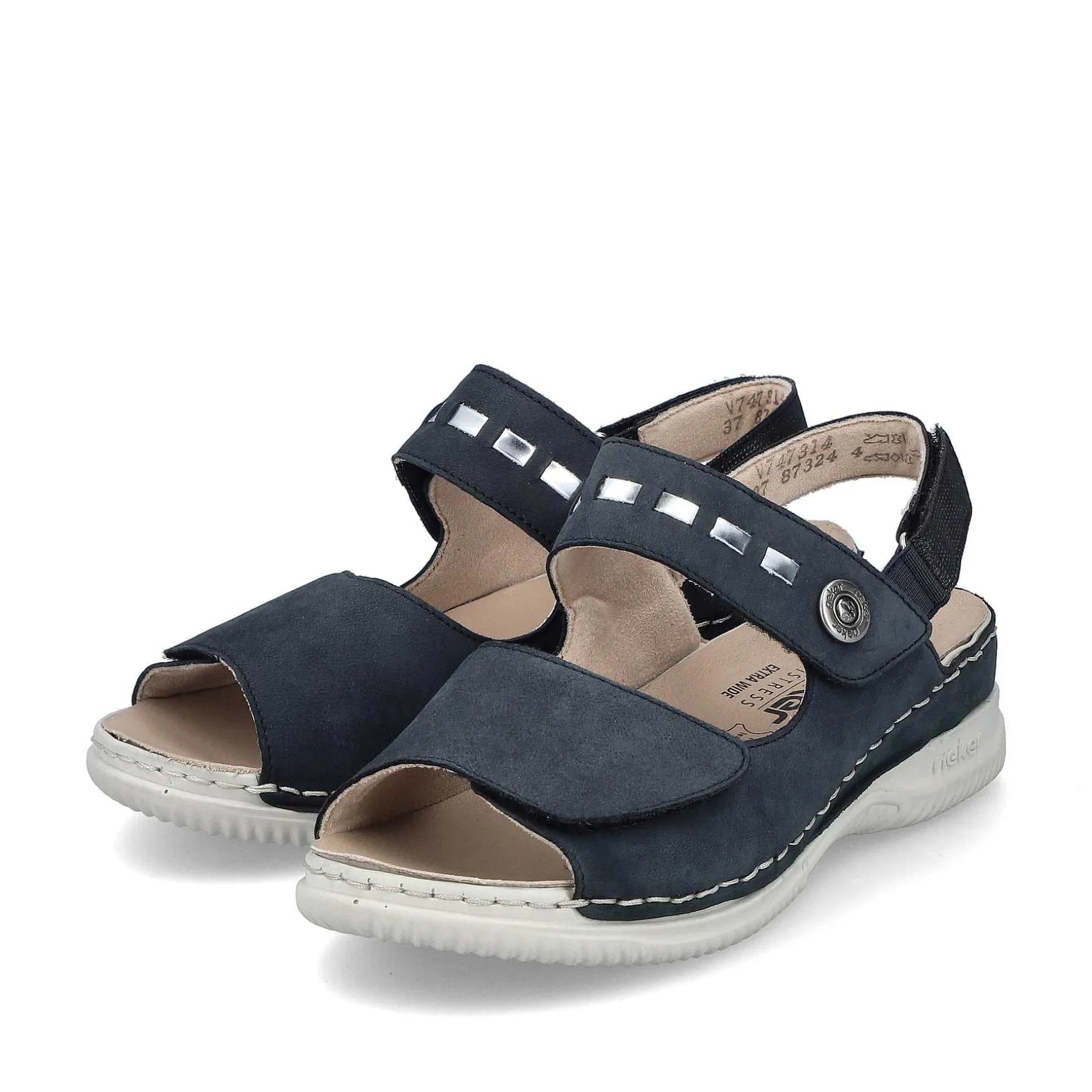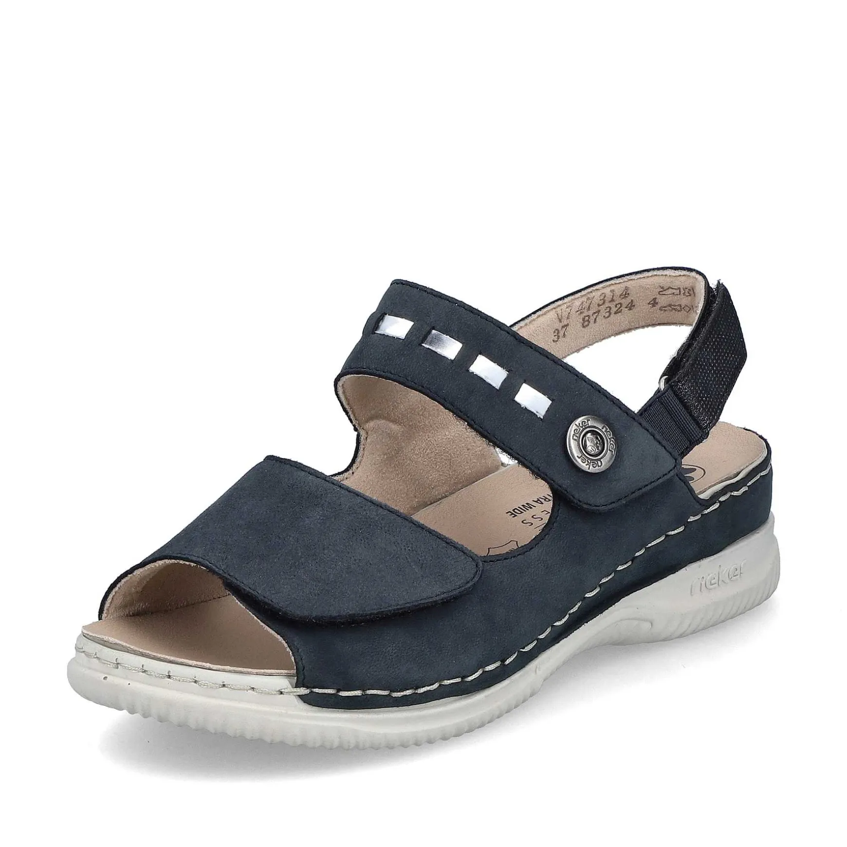 We Love Blue! These Rieker Strappy Sandals For Women In Steel Blue Made Of Suede Let Your Feet Really Feel The Summer. The Best Possible Support And Optimal Fit Are Guaranteed By Straps, Velcro Fasteners And A Heel Strap. The Small Silver Brooch Cleverly Refreshes The Design. The Light And Shock-Absorbing Sole And The Removable Footbed Ensure Comfortable Wearing. Thanks To The Extra Wide H, The Feet Have More Space In The Shoe. Simply Great!