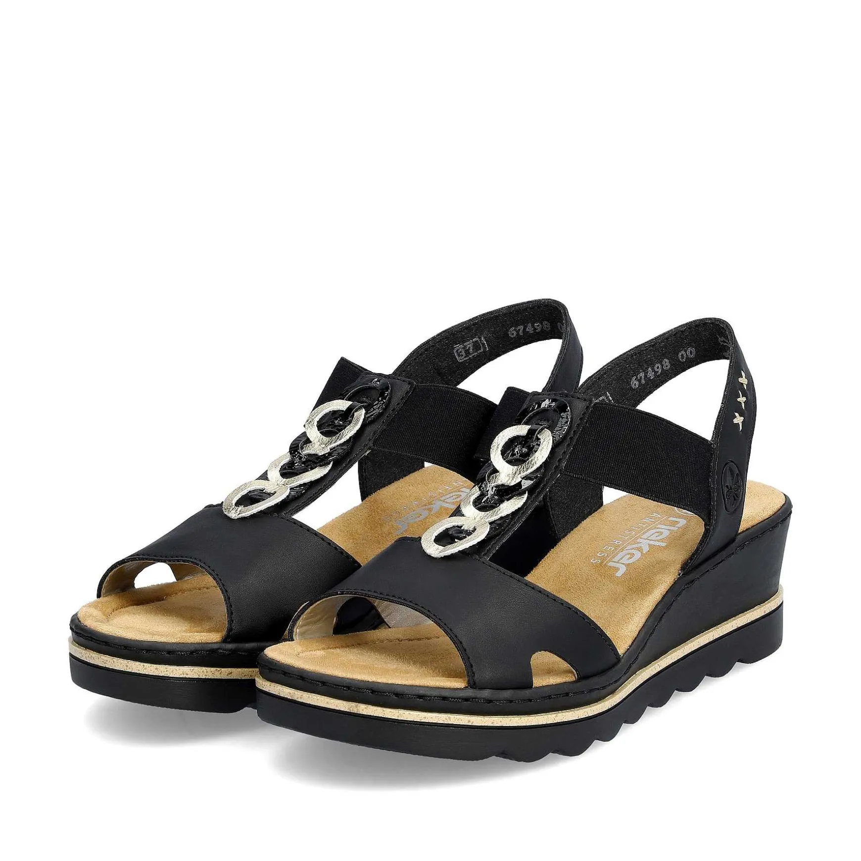Slip In And Feel Good With Rieker! This Deep Black Rieker Wedge Sandal Impresses With Its Modern Design And High Level Of Comfort. An Additional Plus Point Is The Elastic Insert And The Heel Strap, Which Provide Optimal Support And Fit Perfectly With The Overall Visual Appearance. The Middle Strap With A Stylish Two-Tone Chain Ensures The Perfect Finish And An Eye-Catching Look. With The Very Light And Shock-Absorbing Sole With Wedge Heel, Your Feet Will Be Pampered With Every Step. Nice Side Effect: You’Re A Few Centimeters Taller!