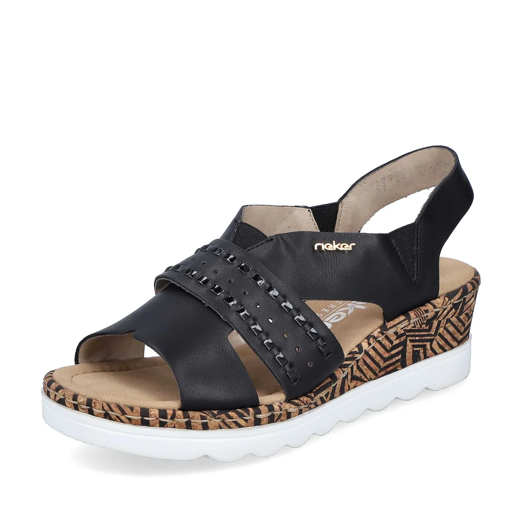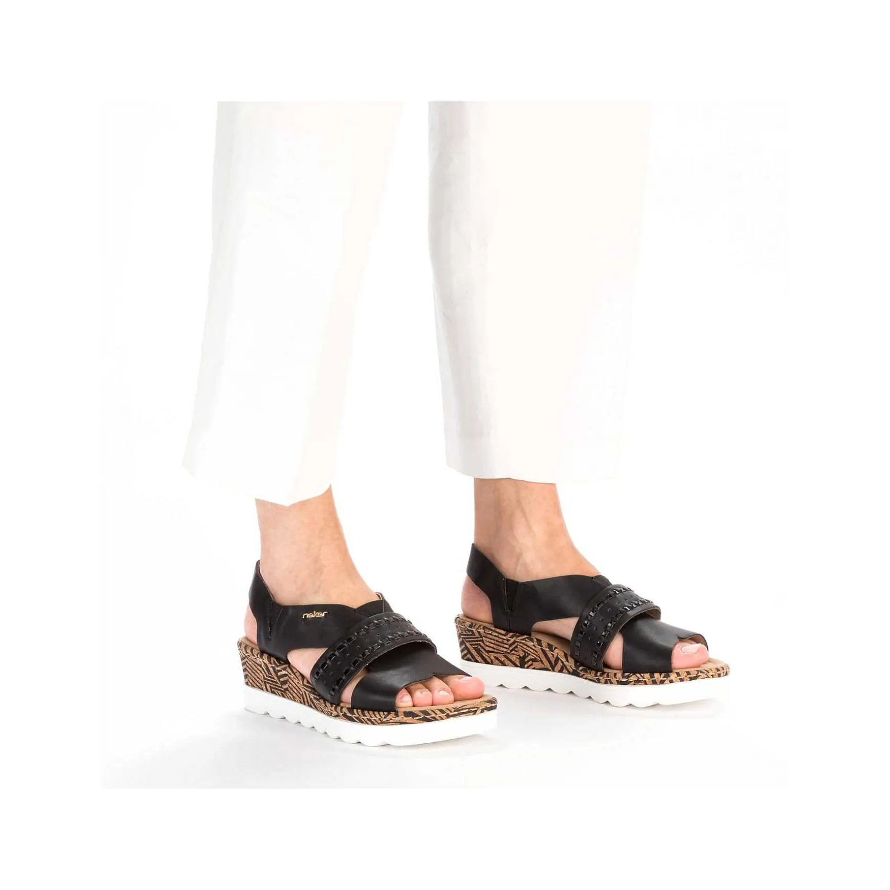 Black Beauty! These Midnight Black Rieker Wedge Sandals Have Been Elaborately Crafted. Optimal Support And A Perfect Fit Are Guaranteed By Straps, Elastic Inserts And A Heel Strap. The Tropical Pattern On The Sole Adds That Certain Something. The Sole With A Wedge Heel Is Both Shock-Absorbing And Very Light, Offering A Double Feeling Of Comfort With Every Step. All In One – Great!
