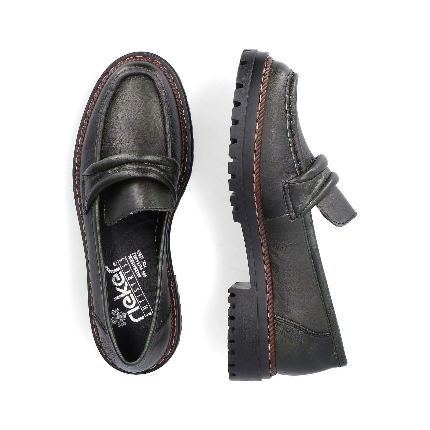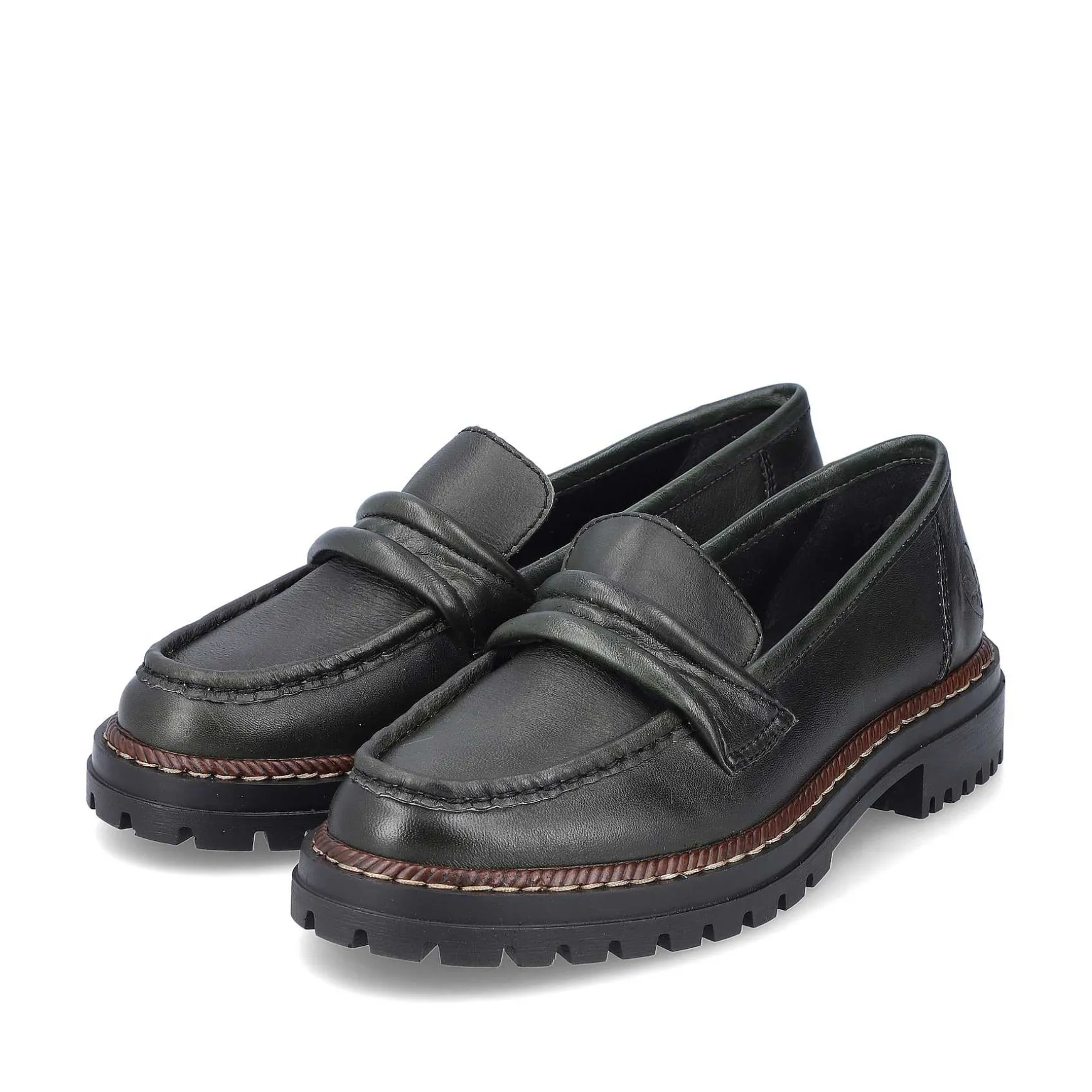 All-Rounder! These Army Green Rieker Loafers For Women Made Of Smooth Leather Feel Particularly Light And Airy On The Foot. The Model Has No Closure And Can Be Put On In No Time. The Decorative Strap Is A Real Eye-Catcher. The Lightweight And Shock-Absorbing Sole Ensures A Comfortable Walking Experience Even When Worn For Long Periods Of Time. The Loafers Also Feature A Soft And Particularly Breathable Leather Insole. These Shoes Are The Perfect Symbiosis Of Style And Comfort!