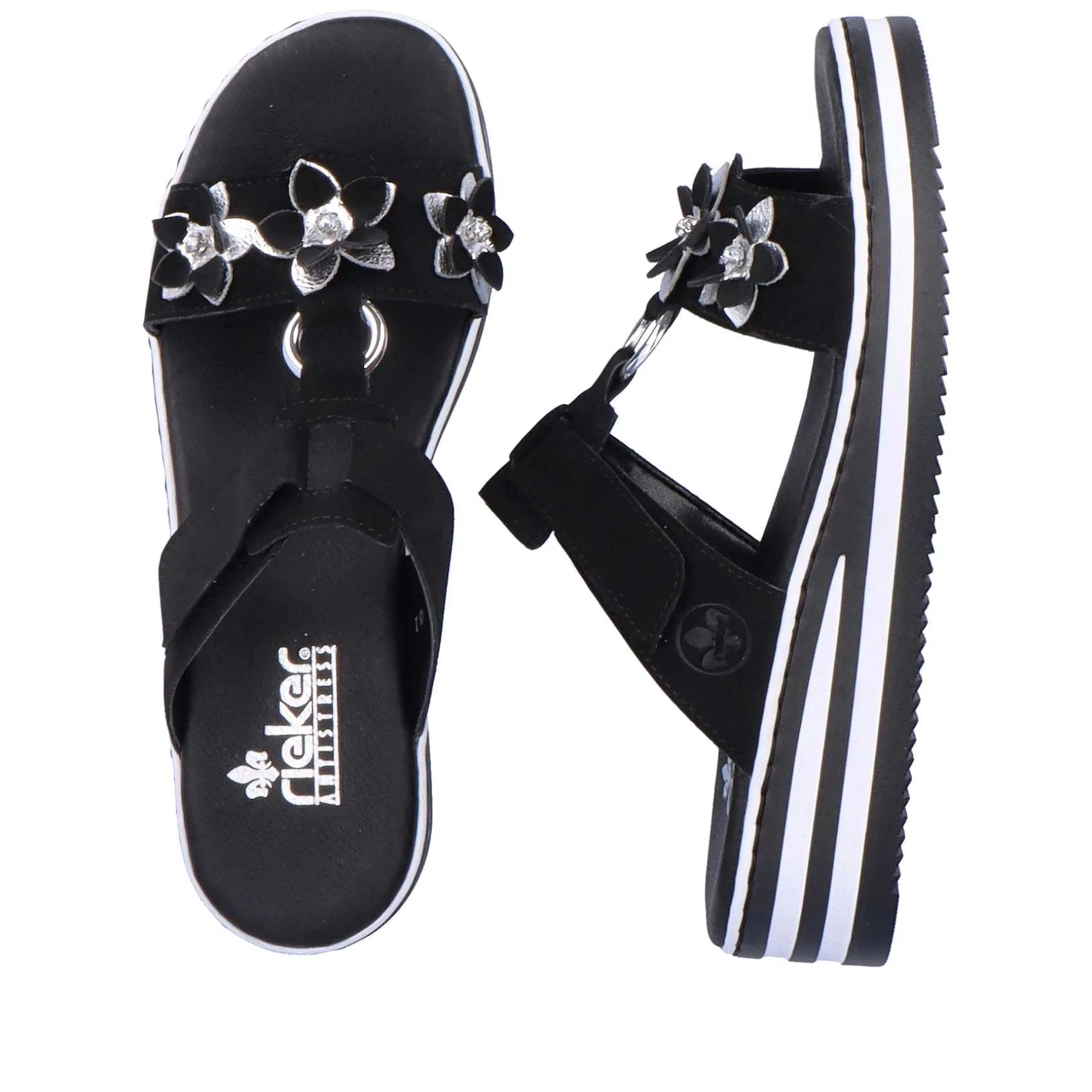 Summer, Sun, Beautiful Shoes! These Graphite Black Rieker Mules For Women Have Been Elaborately Crafted. A Velcro Fastener Allows For Quick And Comfortable Entry. The Floral Decoration Perfectly Rounds Off The Modern Design. The Open Shoe And The Light And Shock-Absorbing Sole Ensure A Lasting Feeling Of Well-Being. In Addition, The Extra Soft Insole Ensures An Extra Portion Of Comfort. In Addition, The Slim E 1/2 Fit Provides Additional Support. Searched, Found!
