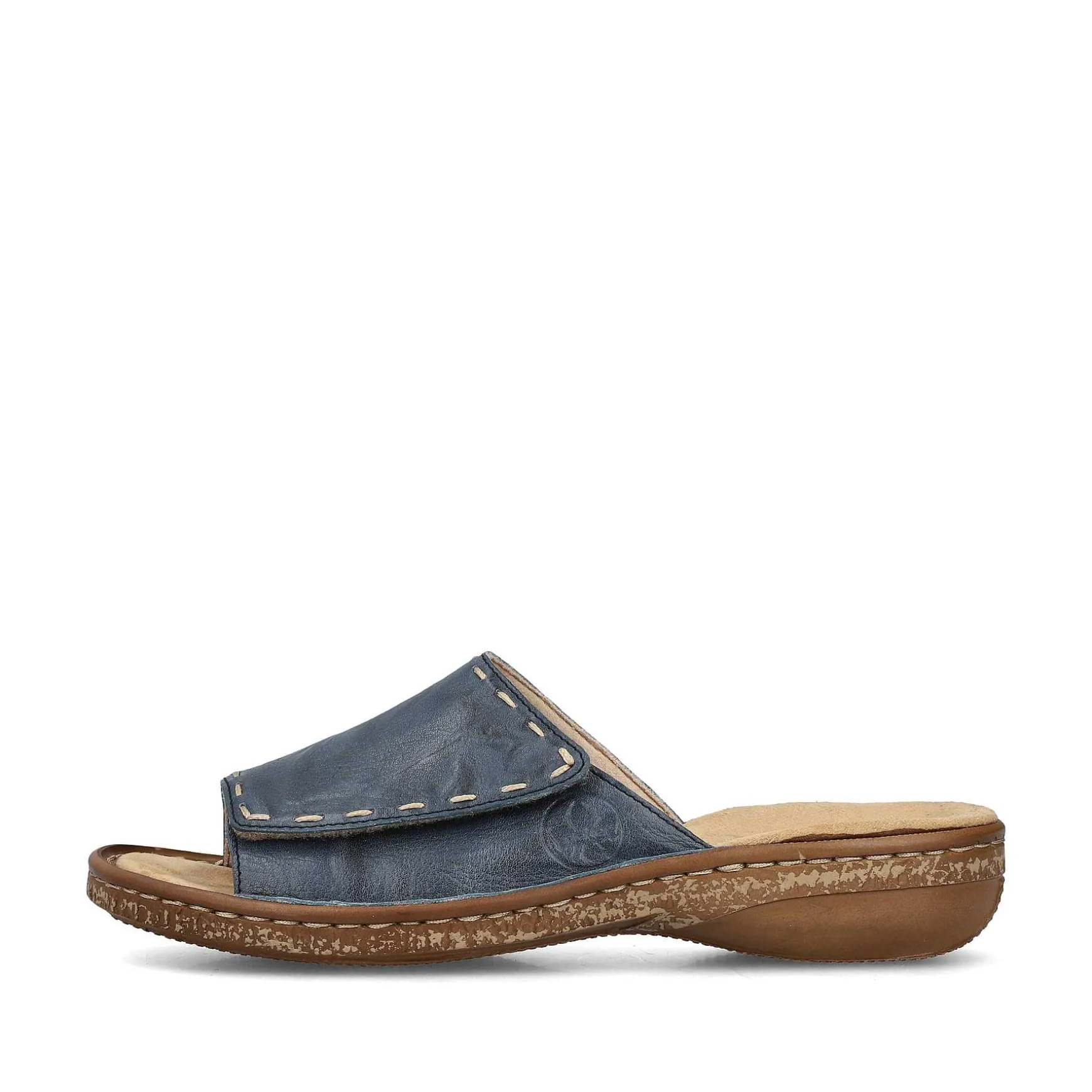 Summer Love! These Slate Blue Rieker Mules For Women Made From Smooth Leather Are Perfect For Every Day. The Velcro Fastener Allows For Quick Entry And Keeps The Shoe Optimally On The Foot. The Decorative Seams Perfectly Round Off The Modern Design. The Shock-Absorbing And Lightweight Sole Of The Mules Offers The Best Walking Comfort. Thanks To The Narrow E 1/2 Fit, The Shoe Fits Like A Glove. Slip In And Feel Good!