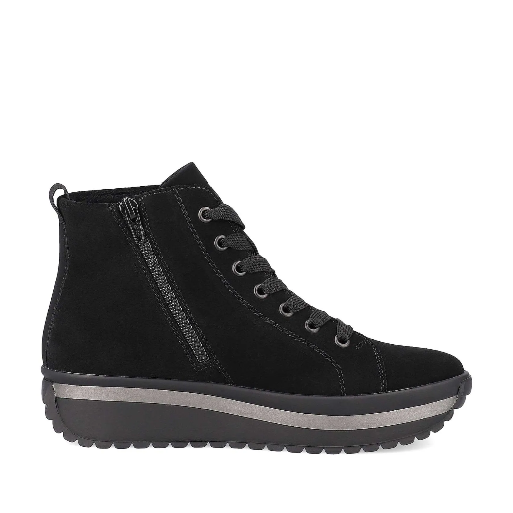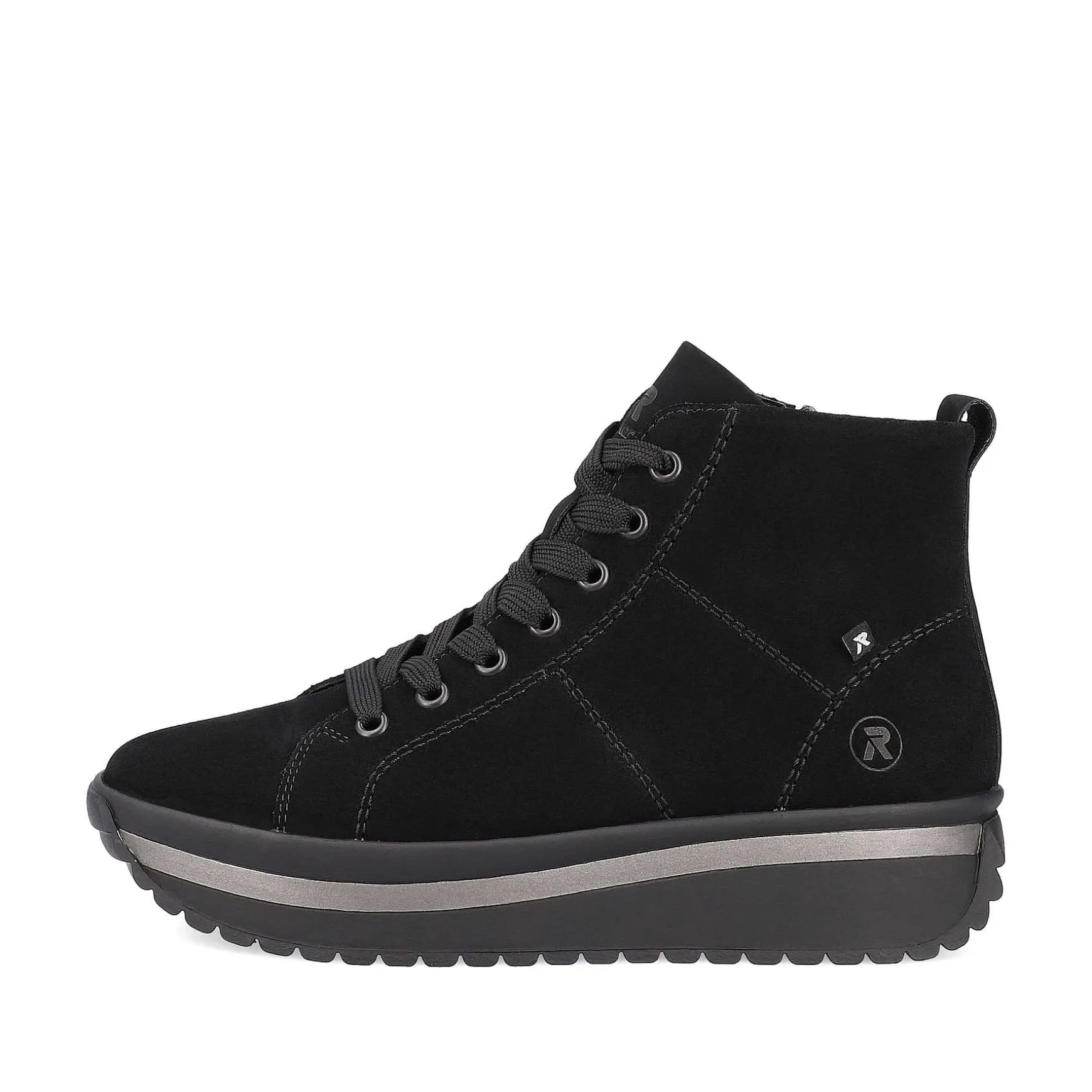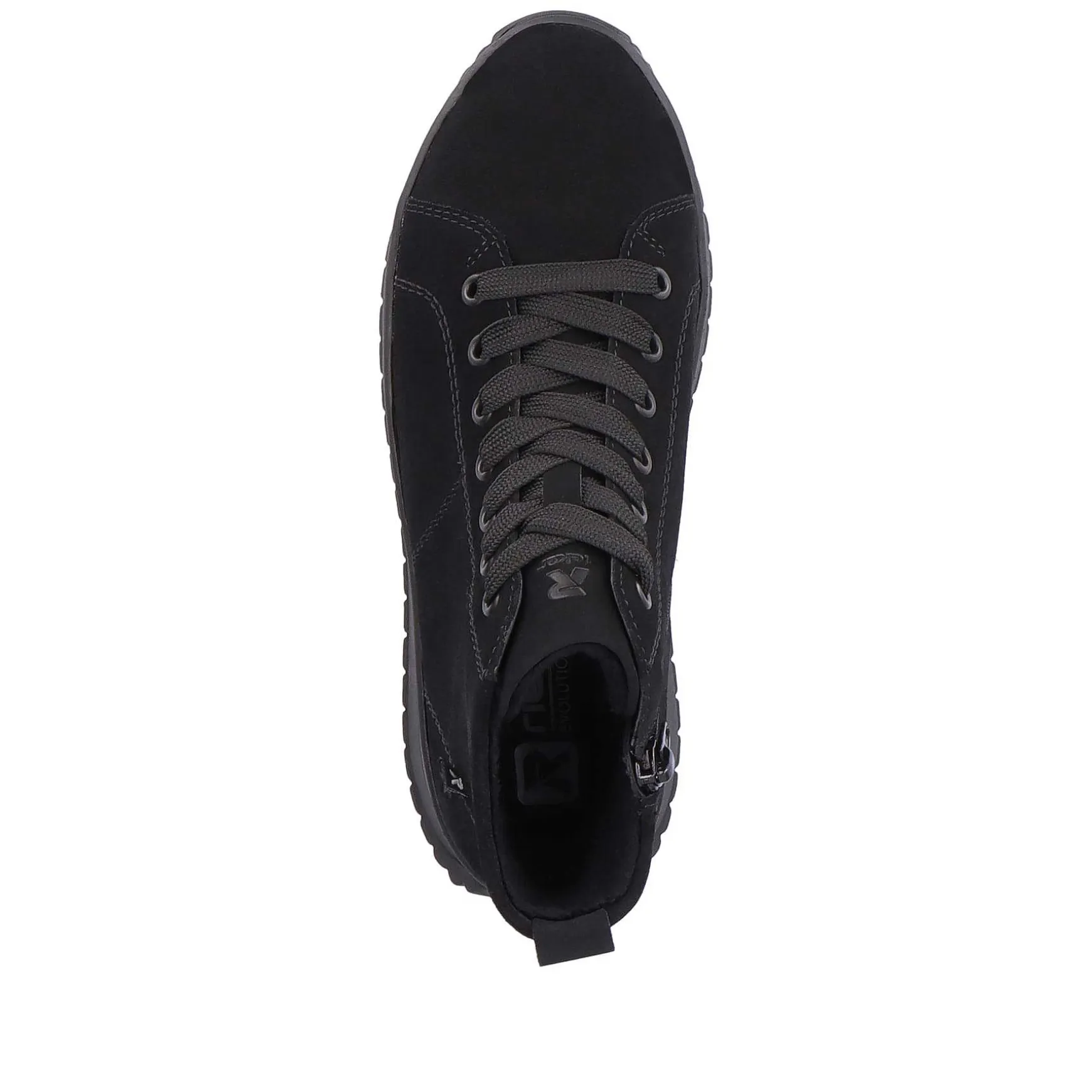 These Black Sport & Style Rieker High Sneakers For Women Made Of High-Quality Suede Are Easy To Put On With A Zipper. The Tr Sole Features An Ultra-Light, Super Soft Core Inside For The Next-Level Walking Experience. The Soft Insole Additionally Cushions Every Step.