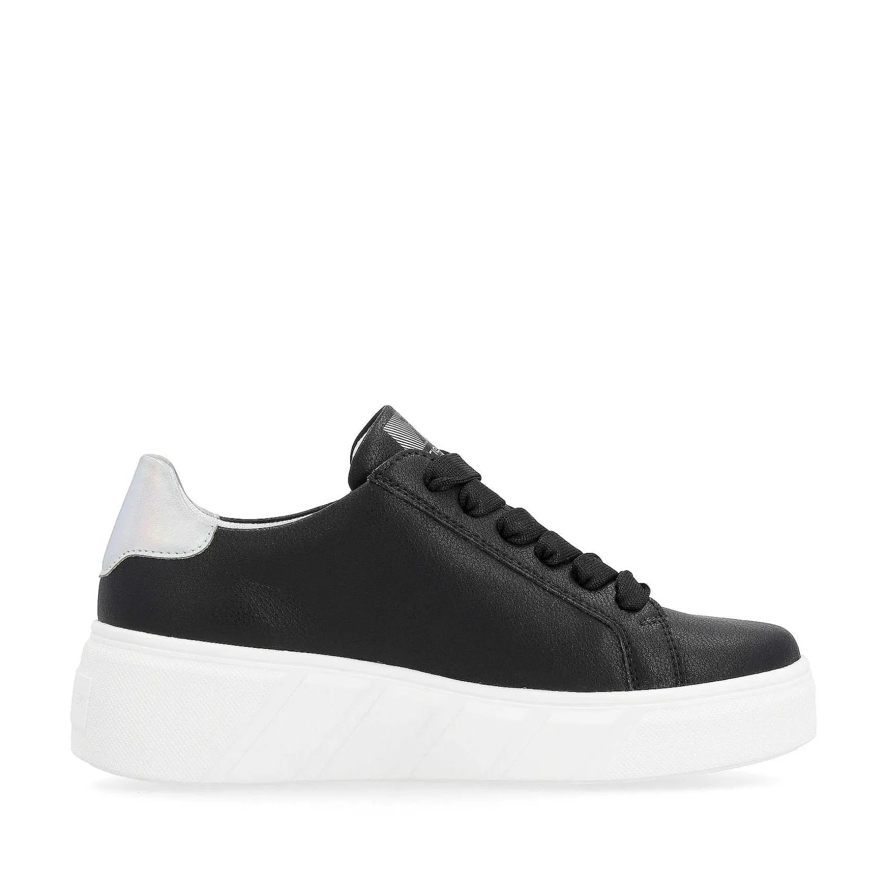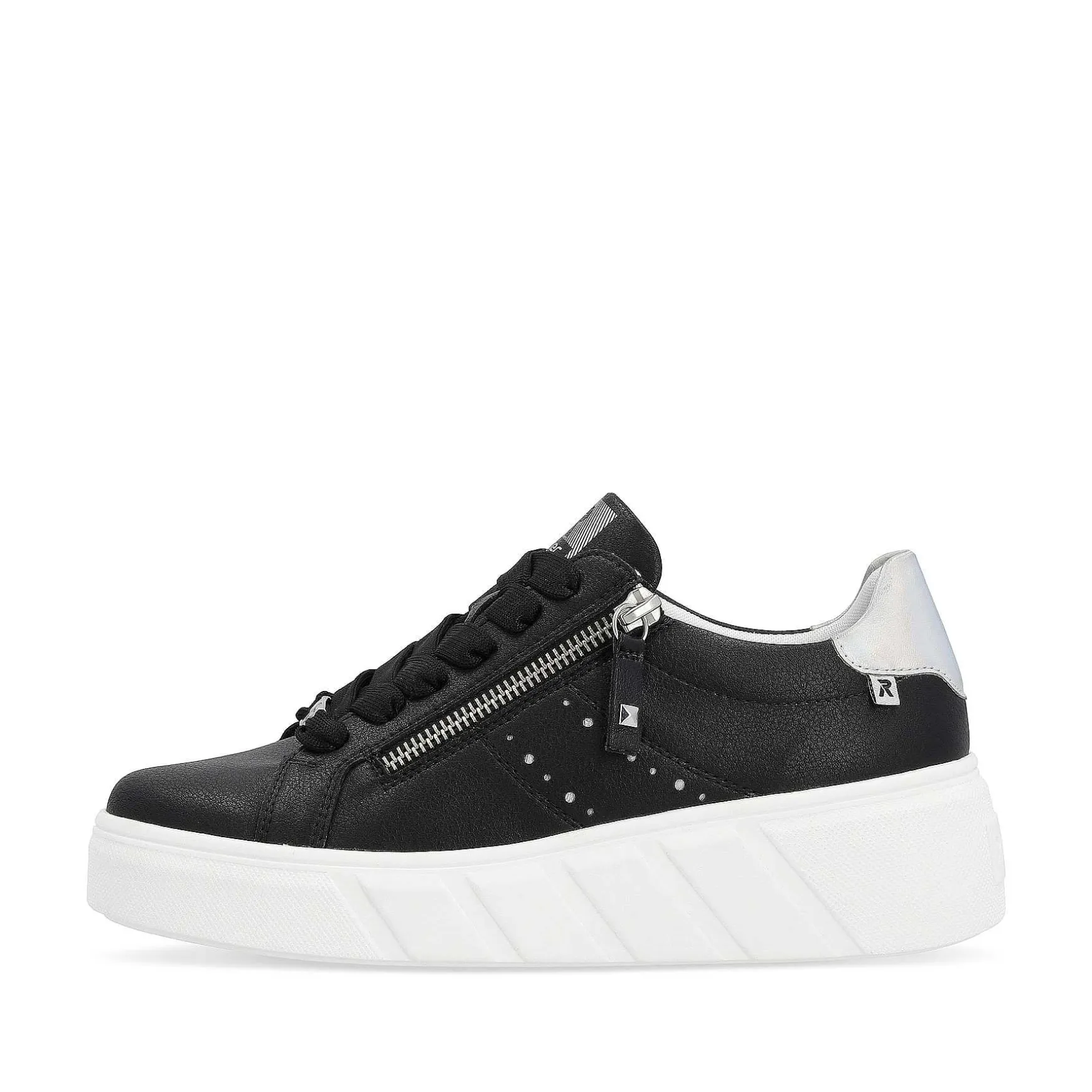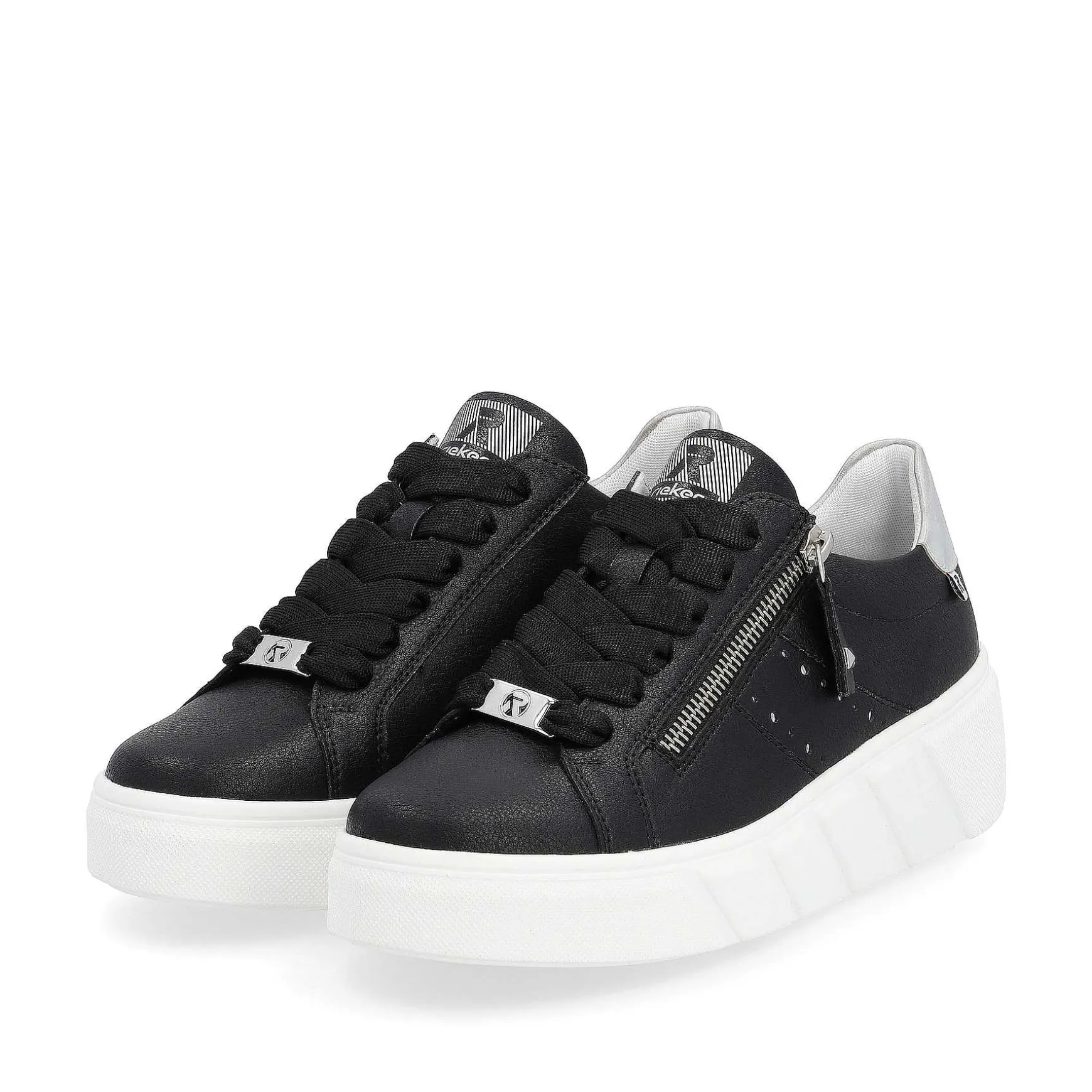 These Black Sport & Style Rieker Sneakers Low For Women Made Of High-Quality Smooth Leather Are Closed Easily And Quickly With A Zipper. The Light Pu Sole In White Is Ultralight And, Together With The Removable, Soft Insole, Ensures Optimal Cushioning.