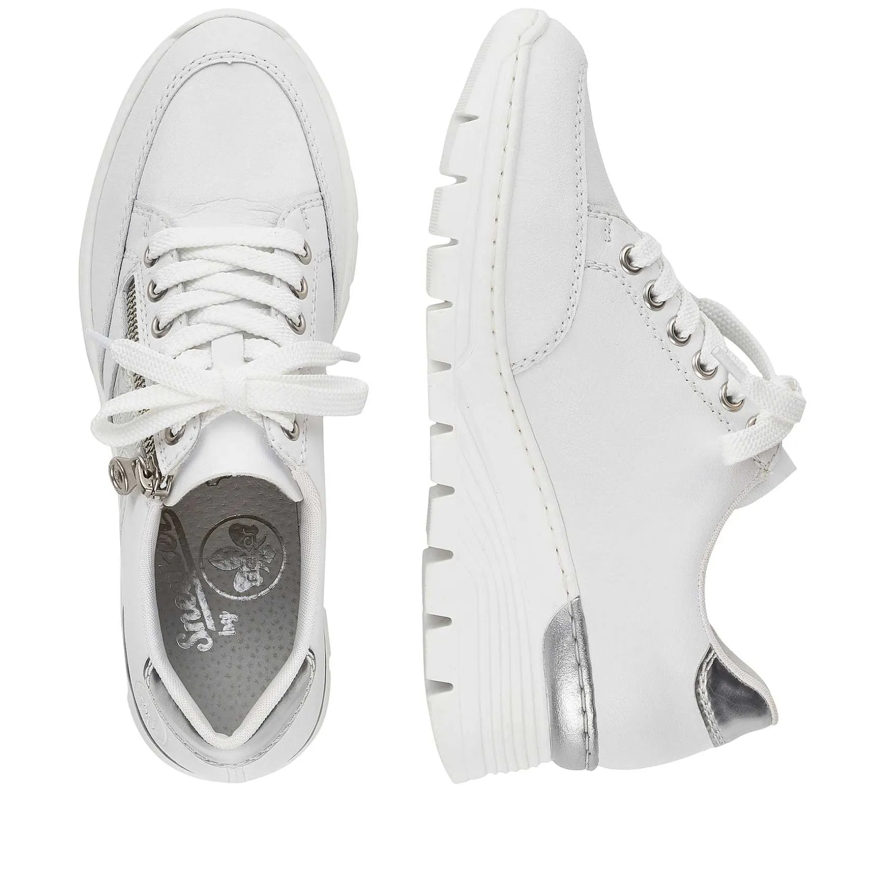 Fashionable Must-Have! These Casual Pure White Rieker Low Sneakers For Women Made Of Smooth Leather Are Cozy Companions On All Your Trips. A Zipper Complements The Lacing And Ensures Functionality And Comfort. The Shock-Absorbing And Very Light Sole Offers The Best Walking Comfort. The Sneakers Have A Removable Insole That Is Like A Vacation For Your Feet! The Comfort Width G Gives The Toes More Freedom Of Movement. More Is Not Possible!