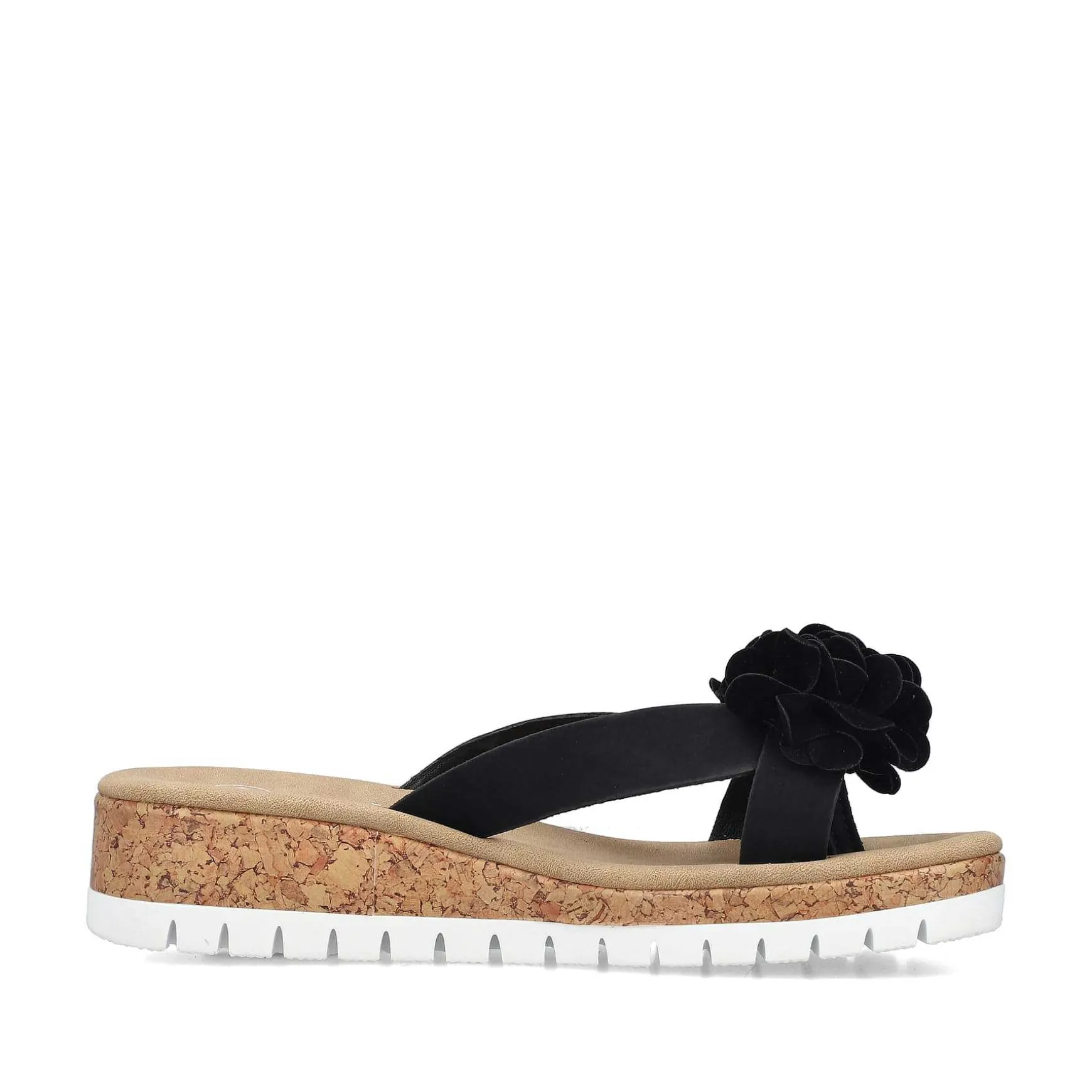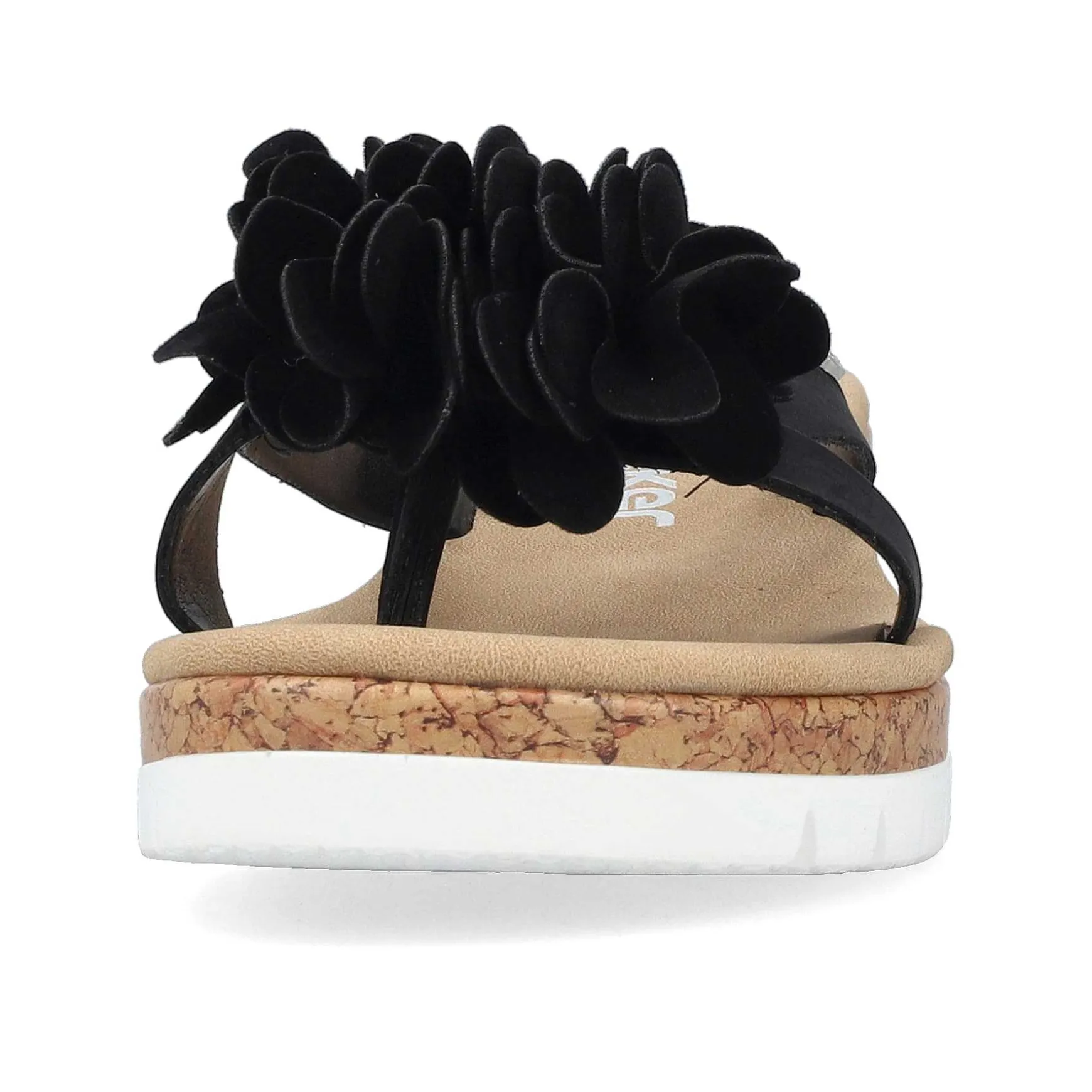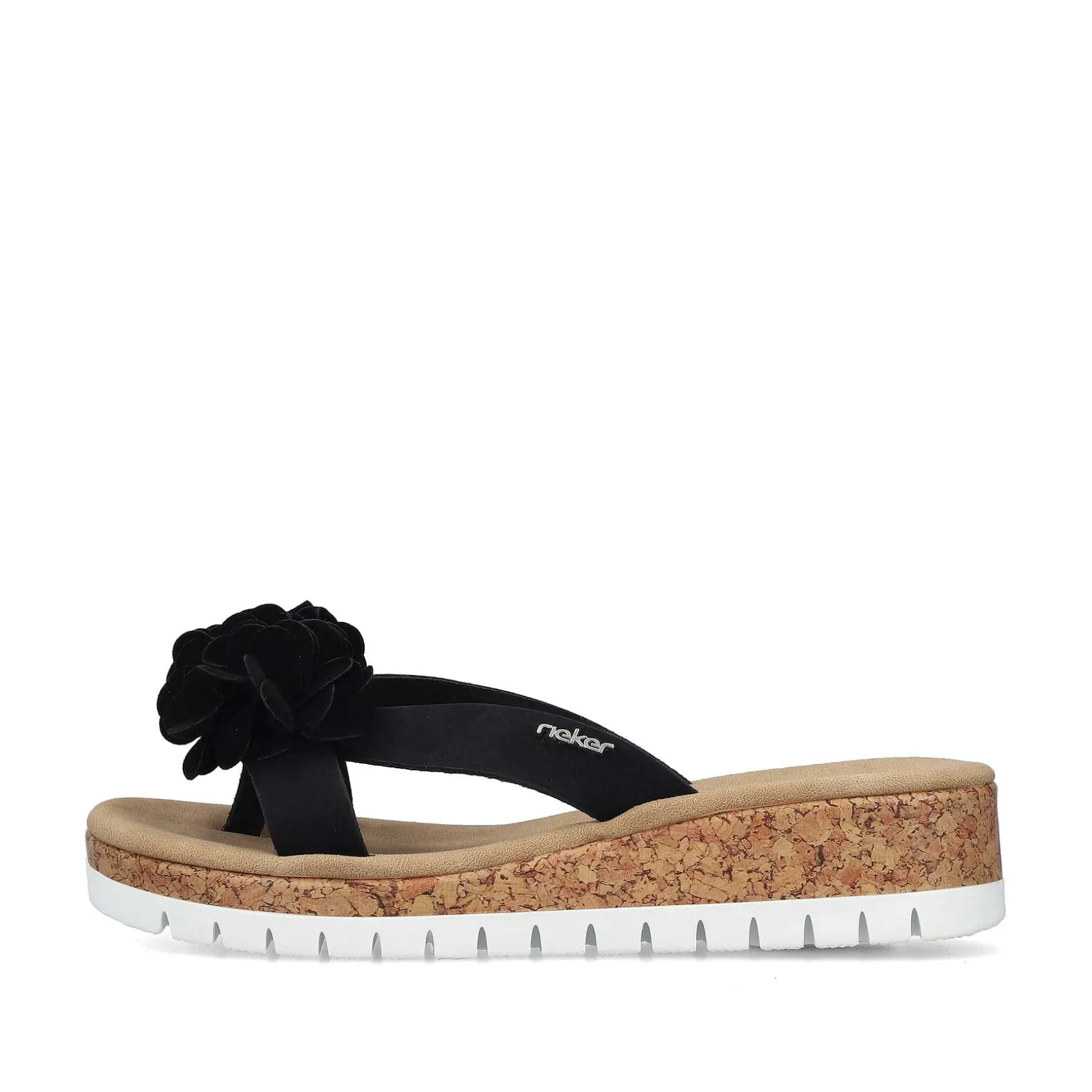 Walking On Sunshine – At Least It Feels Like It. With These Deep Black Rieker Toe Separators For Women You Are Cool And Casual On The Go. The Shoe Can Be Easily Put On By Slipping It On Without A Fastener. The Decorative Flower Ensures The Perfect Finish And An Eye-Catching Look. With The Lightweight And Shock-Absorbing Sole With Wedge Heel, Your Feet Will Enjoy The Best Walking Comfort With Every Step. Thanks To The Narrow E 1/2 Fit, The Shoe Fits Like A Glove. Simply Great!