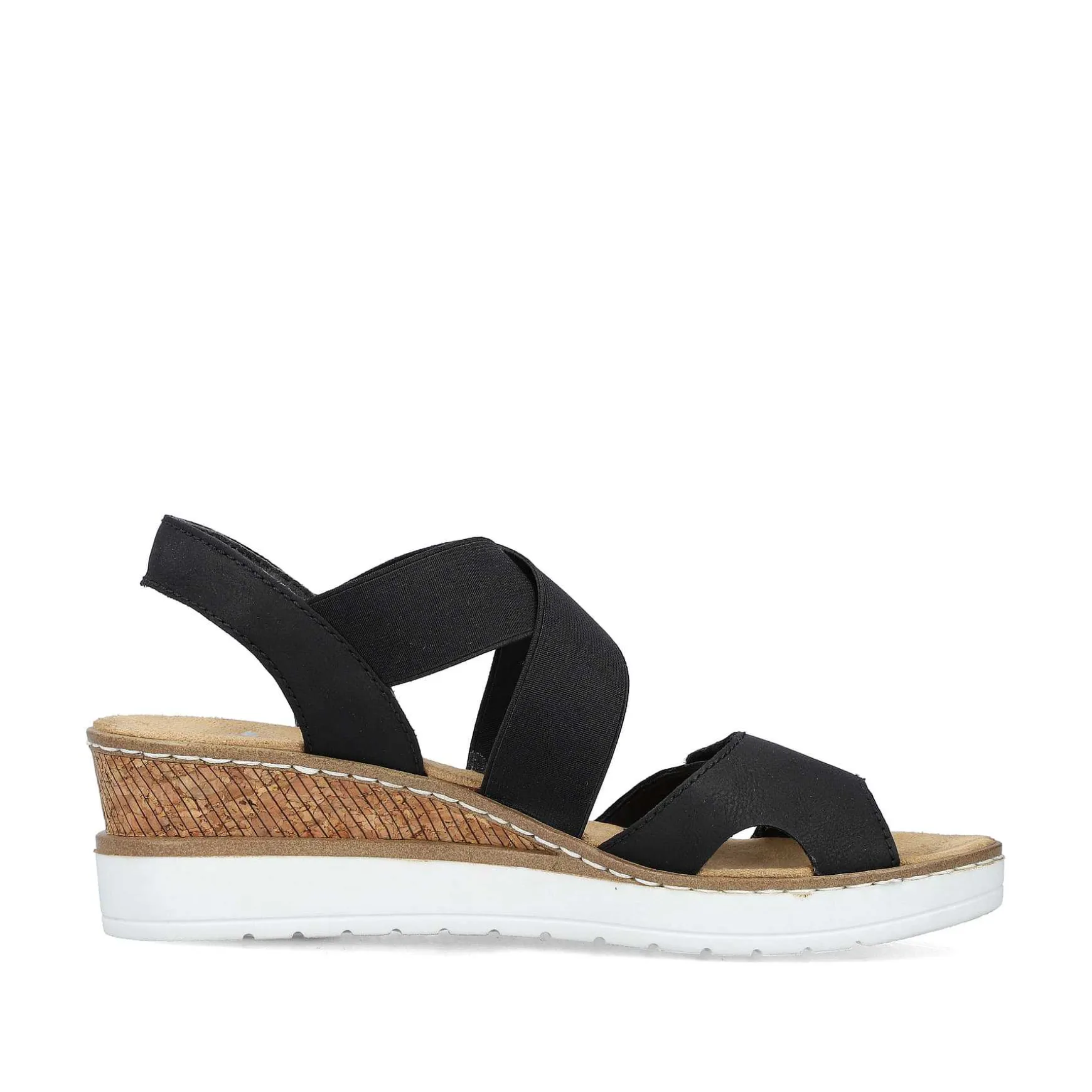 Happy Feet, Happy Life! This Deep Black Rieker Wedge Sandal Impresses With Its Modern Design And High Level Of Comfort. The Elastic Insert Allows For Comfortable Entry. The Shock-Absorbing And Lightweight Sole With Wedge Heel Ensures A Comfortable Walking Experience Even When Worn For Long Periods Of Time. Fashionable Wellness Feeling In The Style Of Rieker!