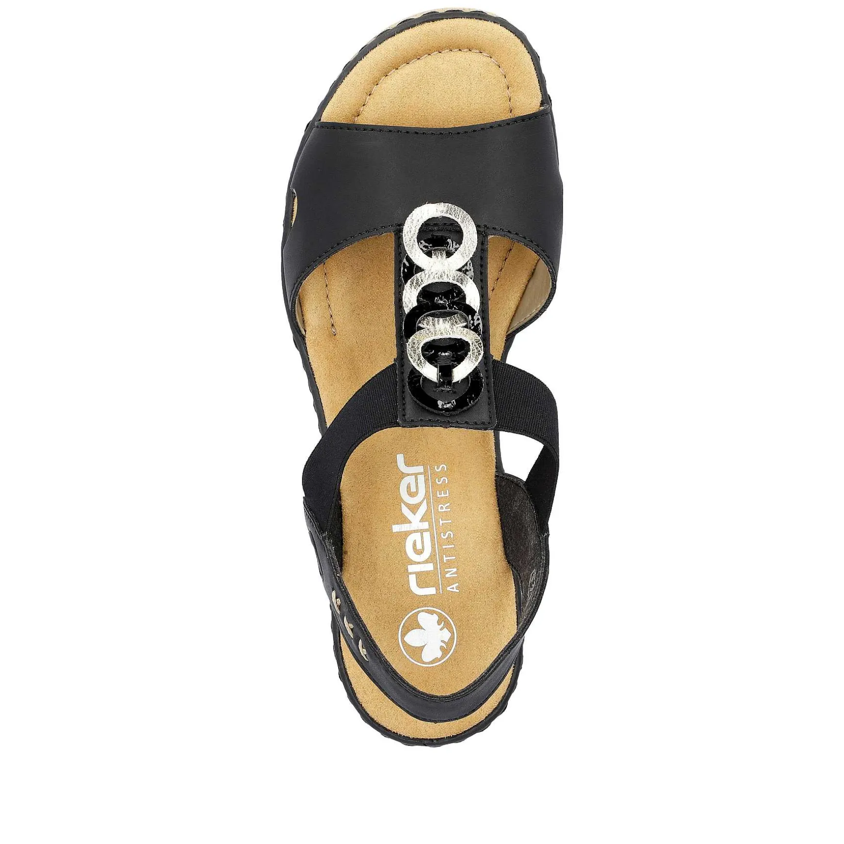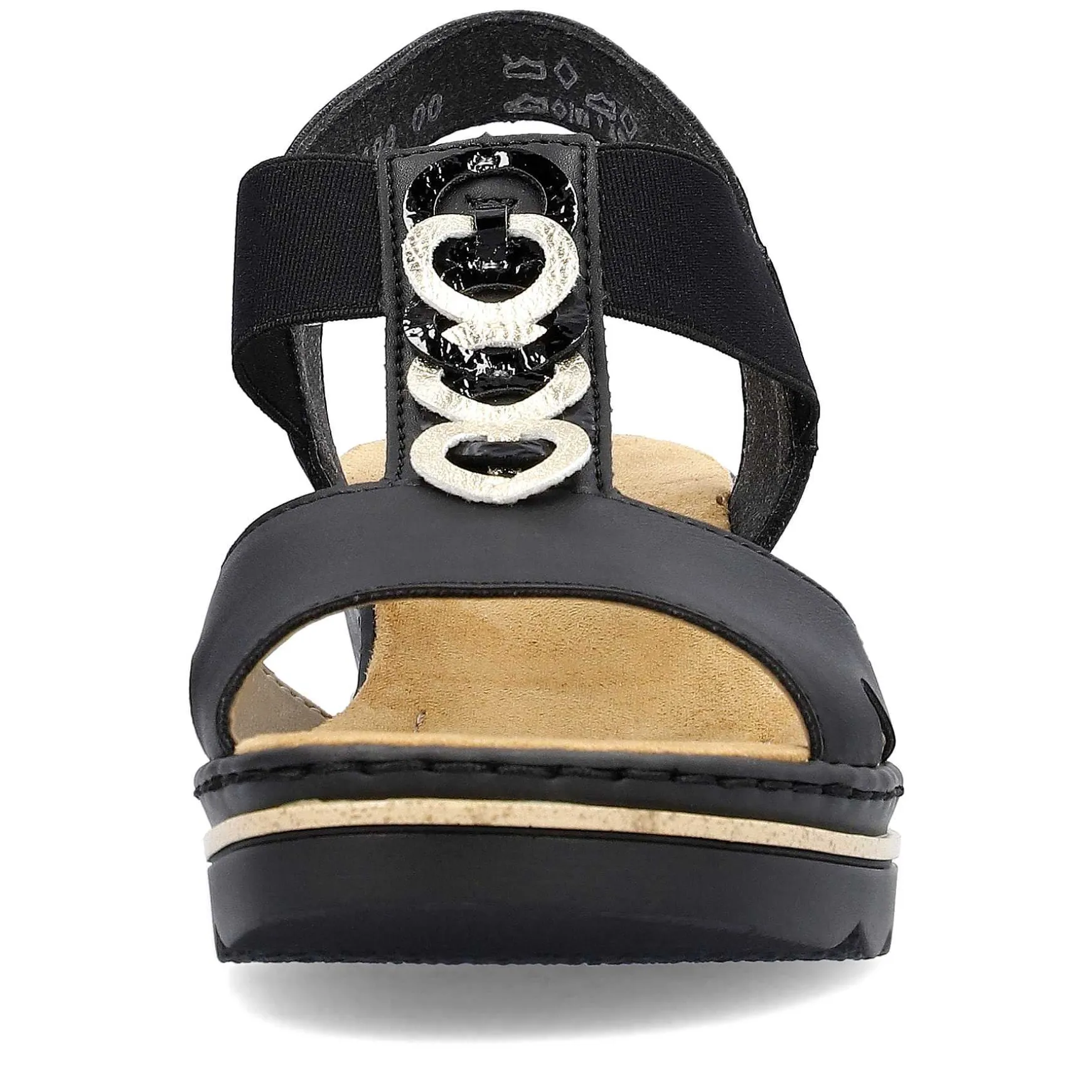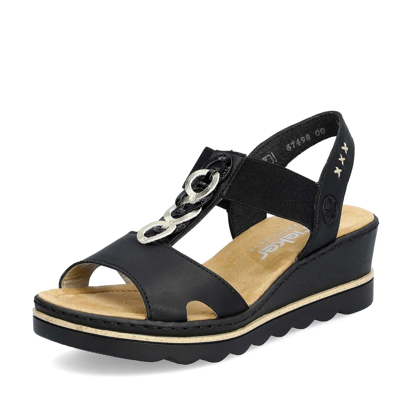 Slip In And Feel Good With Rieker! This Deep Black Rieker Wedge Sandal Impresses With Its Modern Design And High Level Of Comfort. An Additional Plus Point Is The Elastic Insert And The Heel Strap, Which Provide Optimal Support And Fit Perfectly With The Overall Visual Appearance. The Middle Strap With A Stylish Two-Tone Chain Ensures The Perfect Finish And An Eye-Catching Look. With The Very Light And Shock-Absorbing Sole With Wedge Heel, Your Feet Will Be Pampered With Every Step. Nice Side Effect: You’Re A Few Centimeters Taller!